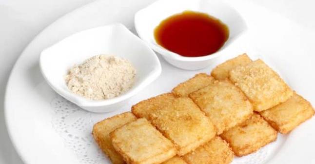 豆皮的“豆”是脱壳绿豆,“皮”是精制米浆,豆皮的馅是糯米,火力要刚刚好,煎出的豆皮外脆内软、油而不腻,形方而薄,色金而黄,吃起来香酥嫩脆。