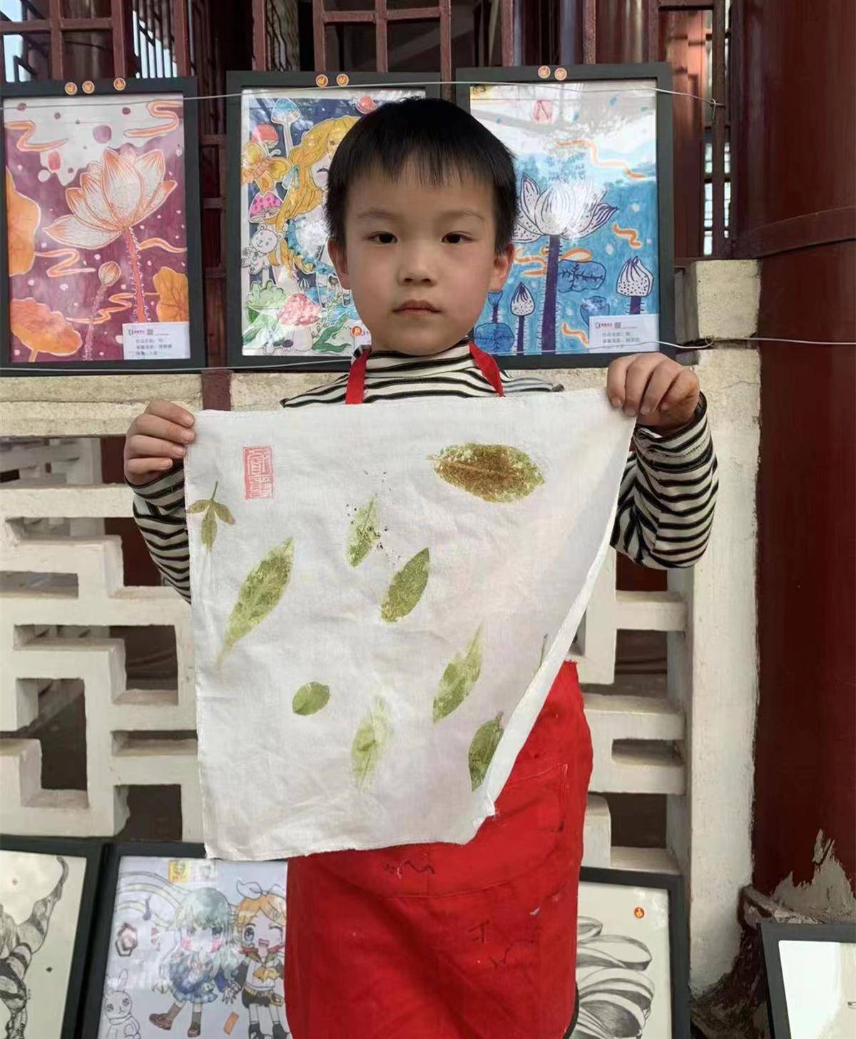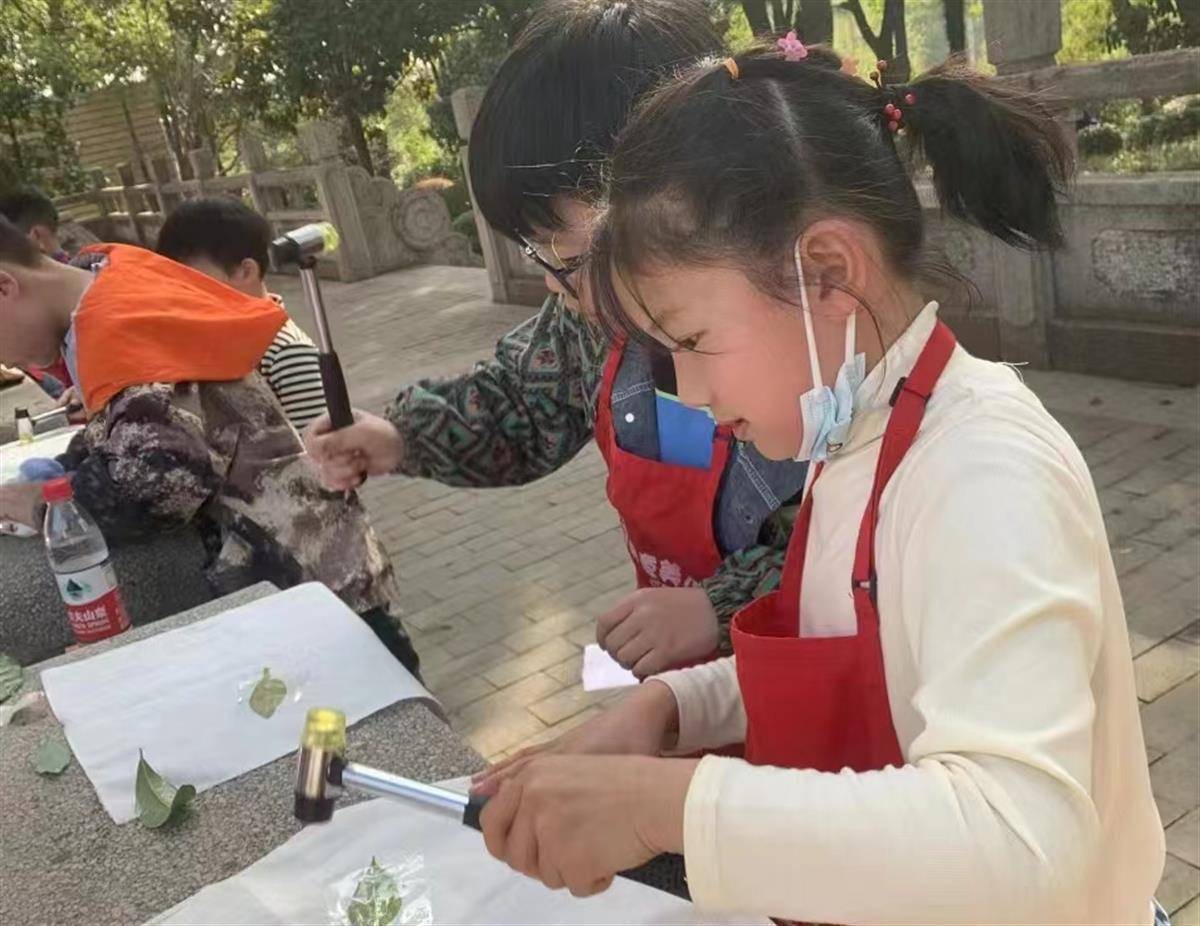 现场放了近300幅美术作品及硬笔书法作品,放眼望去,有浪漫纯真的彩绘,这些作品中有创意无限的动漫,有惟妙惟肖的素描,还有笔力劲挺的硬笔书法。一幅幅作品处处散发出阳光童真的气息,带给大家一种别样的触动。活动中,公园导师带领孩子们开展各种实践活动。有的孩子捡拾一枚枚凋谢的花朵和叶子,用小锤子将植物的香味、纹理、色彩拓印到白布上,瞬间白布变成了一块艺术品,记录下特别的大自然之美;有的孩子尽情发挥自己的想象力,在普通的小发夹上面挤满“甜甜”的奶油胶,镶嵌可爱的配饰,创造了独一无二的属于自己的发夹,开心极了;还有的小朋友潜心线描的创作,他们用疏密有致的线条勾勒出白玉阁古朴典雅的建筑美。