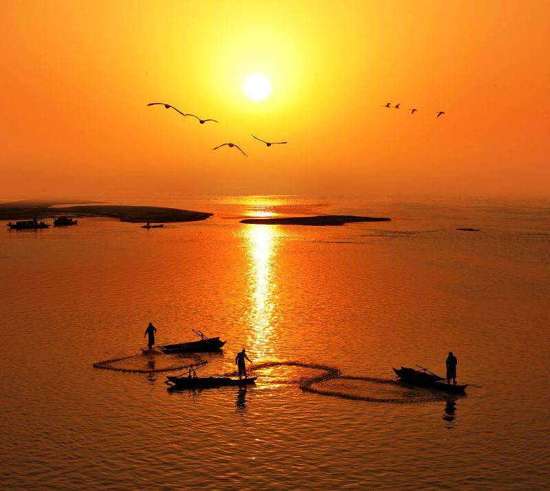 渔民撑着小竹排,湖面次次被泛起波澜,耳旁一片静谧,只听得水声当啷。