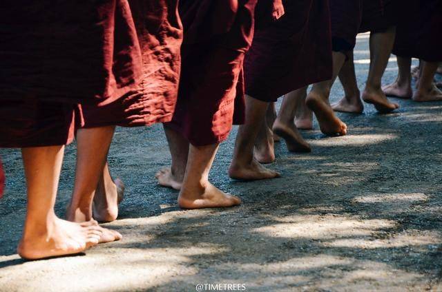 随着钟声响起,10点整,1000多名僧侣安静有序地出现在水泥路上,形成了一个长长的队伍。他们中有小僧人,也有老僧人,有的穿着白色袈裟,有的穿着藏红色袈裟。他们手持钵,低头默默地走着,神情肃穆,对周围的游客并没有太多的关注或慌乱。