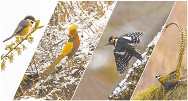 “鸟友”在神农架拍到的鸟儿(从左往右分别是红头长尾山雀、红腹锦鸡、大斑啄木鸟、白冠长尾雉)。