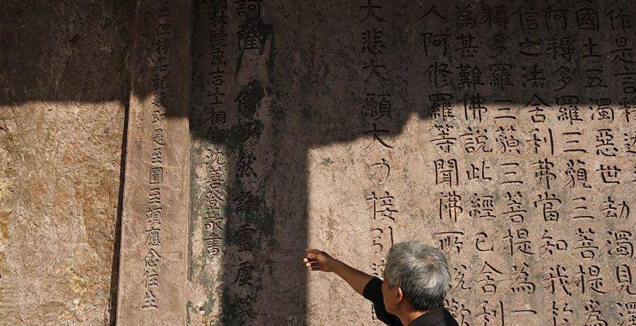 原来石刻上的经文是有金粉附着的,现在金粉已经不存在了,因为年份久远,年久失修,石壁上布满了青苔,经文字迹的空隙中也也有不少青苔跟石灰。后来保护机构对阿弥陀经石刻进行了科学保护,把崖壁顶部进行了排水引水,减少了山水对石刻的侵蚀,根据史料记载修建石经阁建筑,避免石刻受到风吹日晒。