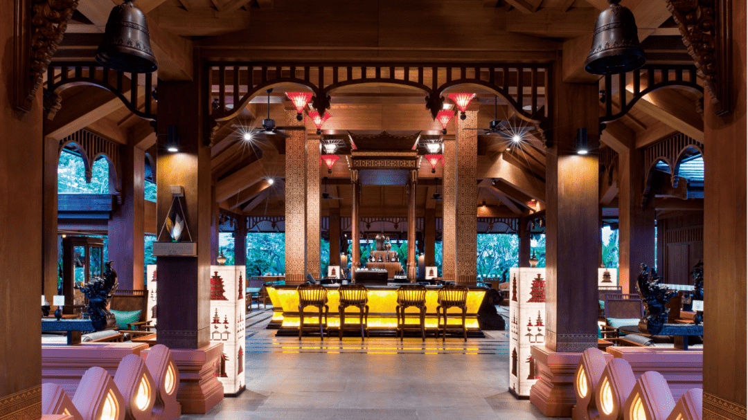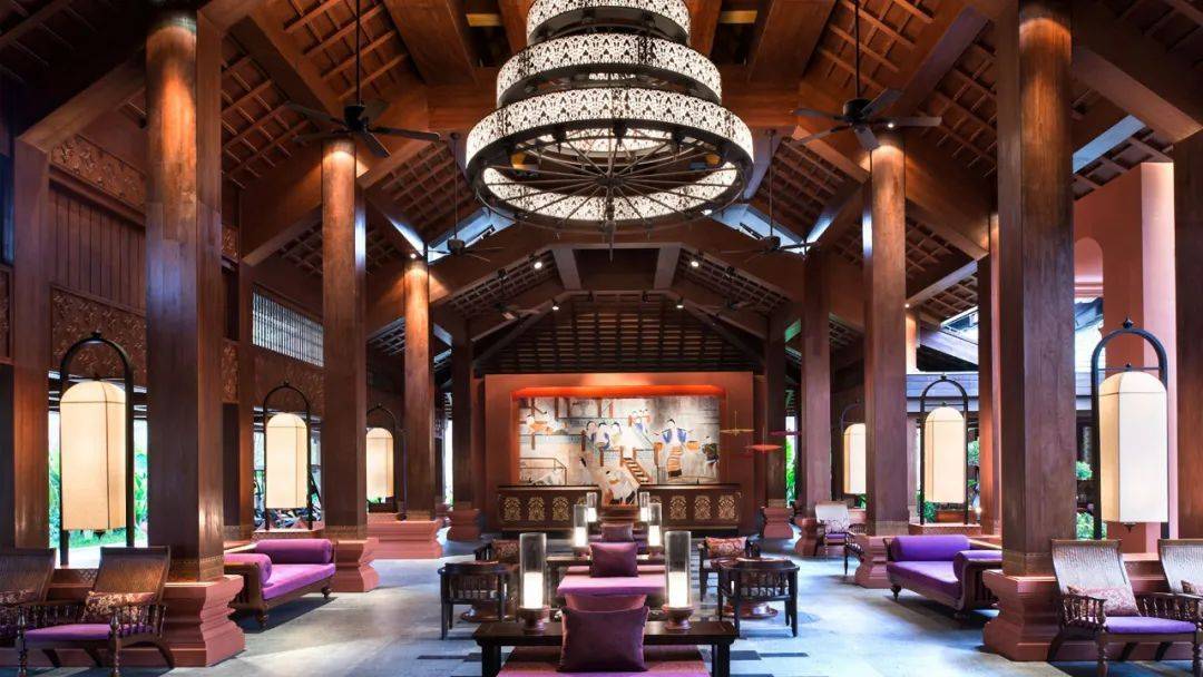 进入酒店大堂,放眼望去,整个空间大气而华丽的傣王宫建筑风格让人叹为观止。