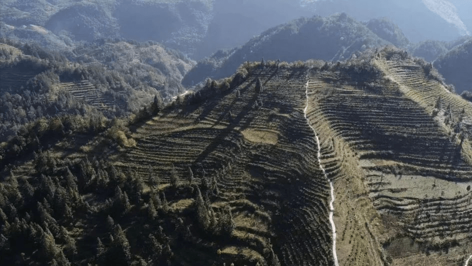 站在木瓜树坪前宽阔平整的油路上,对面长干岭,背后瓦厂堡,茶梯成带成行,从坡脚铺向山顶,泛着春绿,吐着芳香,伸展着或浓或淡的嫩芽,展示着蓬勃生机。右上,紧挨着大院子白墙青瓦小村落的园圃、土地,簇簇茶林茶树围拱着嫩黄嫩绿的菜苗、胡豆、豌豆,一台台层叠往上,竞相吐蕊,跃上岭岗,涂抹着春色,展示着茶香一隅。再前行,进入马家沟、大山坡、生基岭、三台坝,再转到大田坎、蜂背岩、白果树、大坡,半山以上,阳光充足、土肥水美的山上,一片片茶林沿山向上,绣满山岗,一簇簇茶树点缀田边地角,飘来茶香。于是,这个村也因为茶园茶山多而取名为茶香。