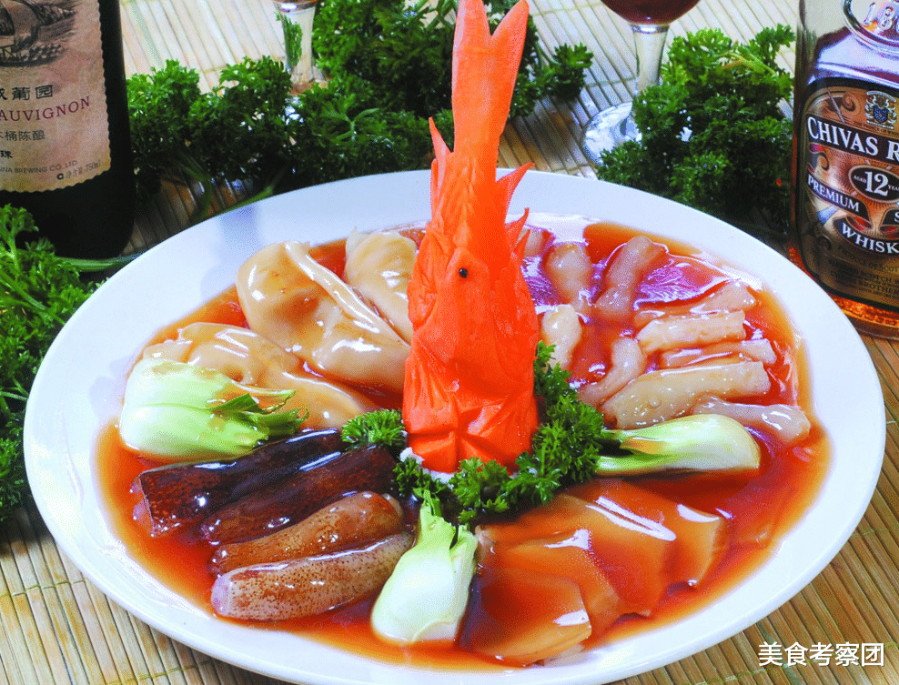最后把龙须菜调味后上锅蒸10分钟做配菜。将调味好的熟广肚、熟鲍鱼、熟鸡脯肉、熟龙须菜依次放入锅中用清汤鸡油慢慢熬煮即可。这样做出的三丝鱼翅口感脆美、营养丰富、气质鲜美。