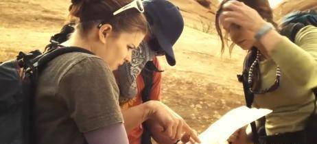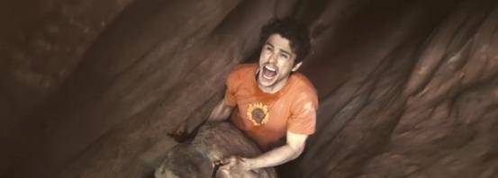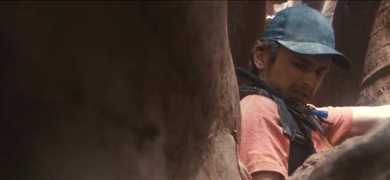 结束了导游的工作,阿伦又踏上了前往峡谷的道路。他一边听歌一边在石缝间穿行,潇洒得不行。可老司机也有翻车的一天,在跳下一片石缝的时候,松动的石头滚落下来,卡住了阿伦的右手。不论他怎么用力,都无法松动石头或者拔出自己的手。他又朝天空呼喊,但这片区域有人听到他的几率微乎其微,逐渐冷静下来的阿伦开始清点自己的装备,从中找到了一把多功能刀。但估计是个三无产品,刀子很钝,阿伦用它刮石头,可直到天黑石头也没有松动一点,反倒是这把刀被磨掉了一截。没办法,阿伦只得用绳子做了个简易的支撑装置,供自己睡眠。