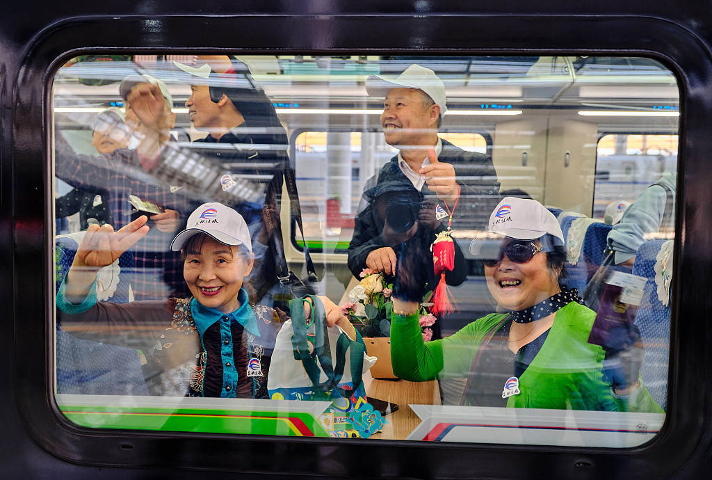 4月13日,昆明南站,中老铁路国际旅客列车开行,乘客在窗边与车外人们微笑互动。视觉中国 图