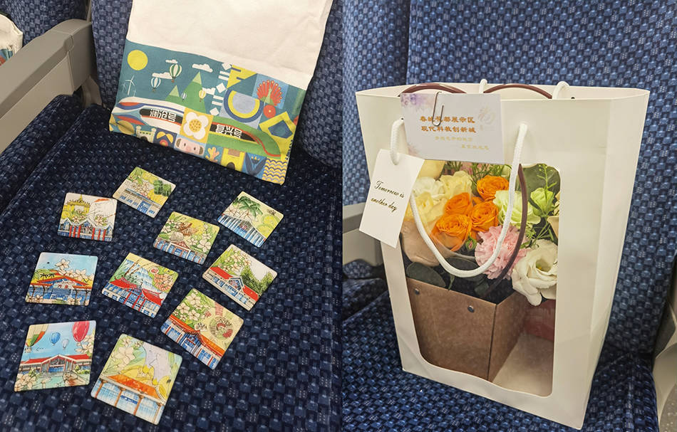 4月13日,D887次列车发车,为乘客们准备的鲜花、冰箱贴等礼物。铁道视界微博 图
