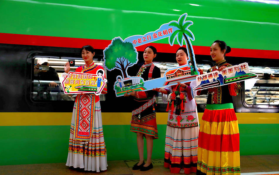 4月13日,昆明南站,中老铁路国际旅客列车开行,工作人员身穿少数民族服饰欢迎旅客乘车。铁道视界微博 图