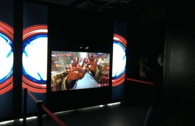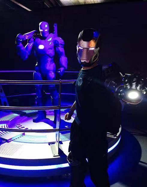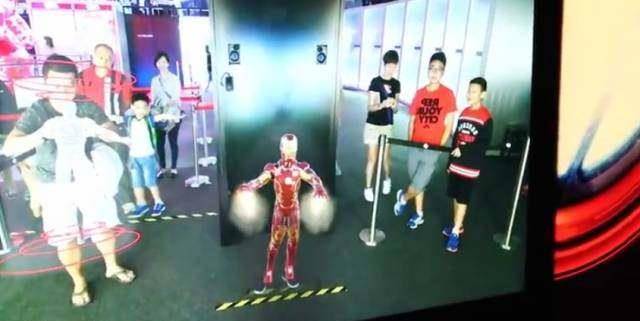 成为钢铁侠。需要排队,最多3个人同时玩。站到指定区域,前方大屏幕会显示自己的影像。