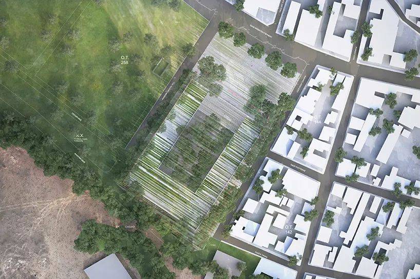 高架结构围绕着种植的开放式中庭形成,网格结构强调了建筑的功能组织。在地面层,该建筑对外开放,一个穿孔的透明立面包裹着结构,让所有的内部元素都暴露在公众面前。因此,该建筑保持透明,平等对待员工和市民。内部构成了一个开放空间,形成了一个封闭的中央中庭,作为一个鼓励表达、互动和对话的公共广场。