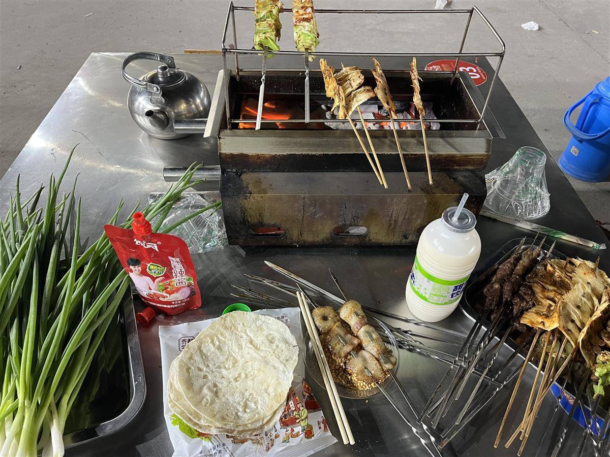 三两朋友,围坐在一起,撸串喝酒聊天,这是本地人杨武(化名)一天中最放松的时刻。他对面的工友拿起几串肥瘦相间的肉串,在火上来回翻面,散发出滋滋声和诱人的香气。他从架子上取下两串冒油的羊肉串,裹上蘸料后摊在小饼上,手掌握住小饼将肉串攥紧,往后一拉签子,在饼里放上一段葱,随手一卷,“咯,这么吃可香了。”