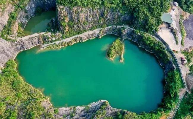 从高处往下看,不仅矿坑湖面的形状是心形,连湖中间的一个“小岛”都是心形的,真可谓“心心相印”、“心连着心”,让人感觉虽是人设,浑然天成,十分有趣!