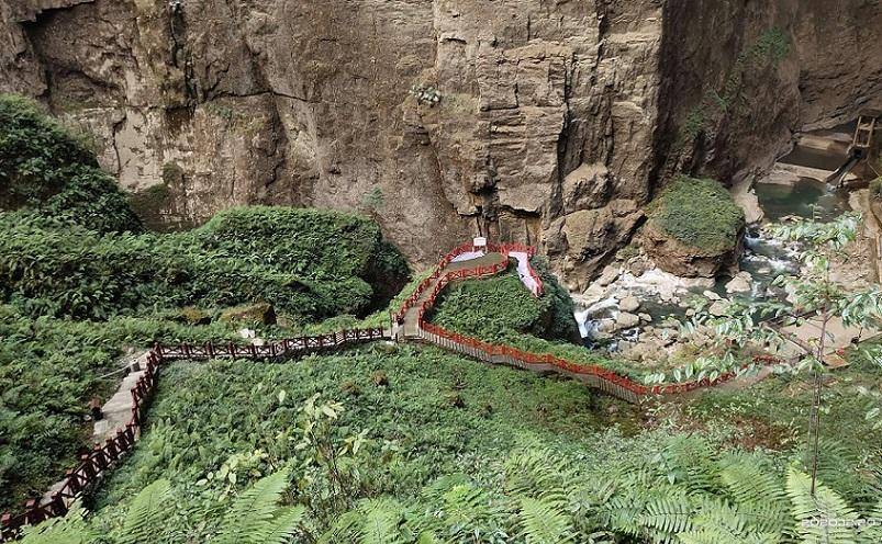 从坑口出发,沿着悬崖边上的小道走到坑底,一路上都是秀美的自然风光和陡峭坑壁上的小瀑布。沿途有两处平台,一处是三百米深的地台,宽处十米左右,可以在这里休息;另一处是位于四百米深的台地,呈斜坡状,草木茂盛,山花烂漫,坑壁上有几个飞瀑直泄坑底。