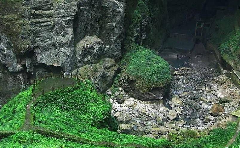 坑底下边有地下河,小寨天坑算得上是地下河的一个“天窗”。坑底有一条通往观景台的小道,昂首仰望,只见一个圆形蓝天,可以深切体会到“坐井观天”的感受。