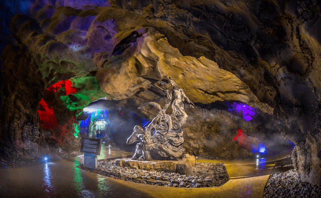 大漏斗,俗称“黑龙潭”,洞中幽深、神秘莫测。进入暗河深处,里面有许多钟乳石,千奇百怪、趣味盎然,如果想象力丰富,不难构思一篇引人入胜的神话故事。游船在洞外与洞中交织变幻,白天与黑夜如流星闪现,让人眼花缭乱、目不暇接。