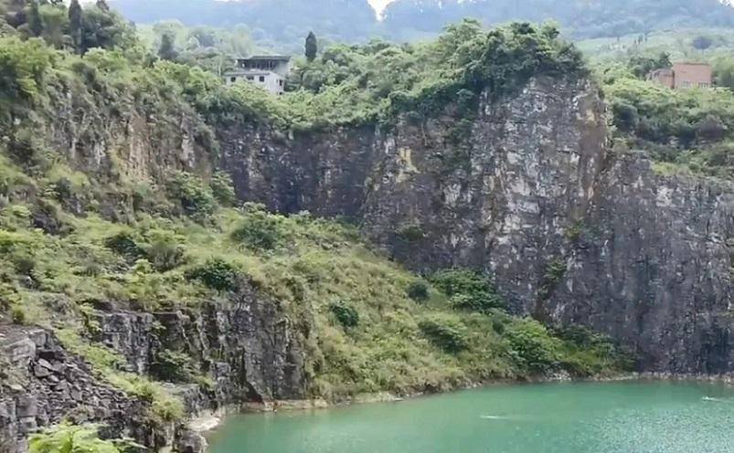 矿坑被群山围绕,已经被绿色植被覆盖,充满了原始的野性,看上去十分自然。裸露的岩壁陡峭嶙峋,在山水中显得桀骜不驯,给青山绿水间增添另类的意境。
