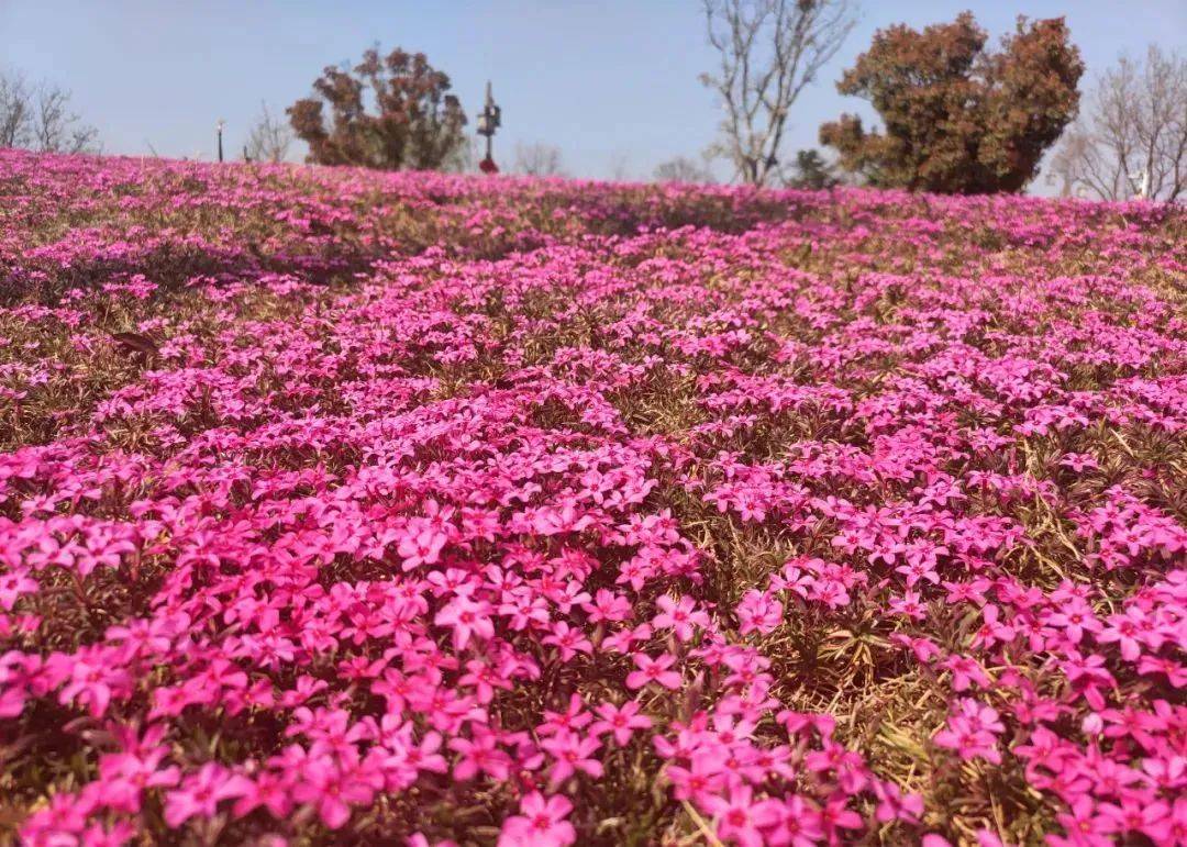 除了郁金香之外,樱花开得正盛,福禄考铺满了地,桃花映着仿古建筑,梨花开在枝头。