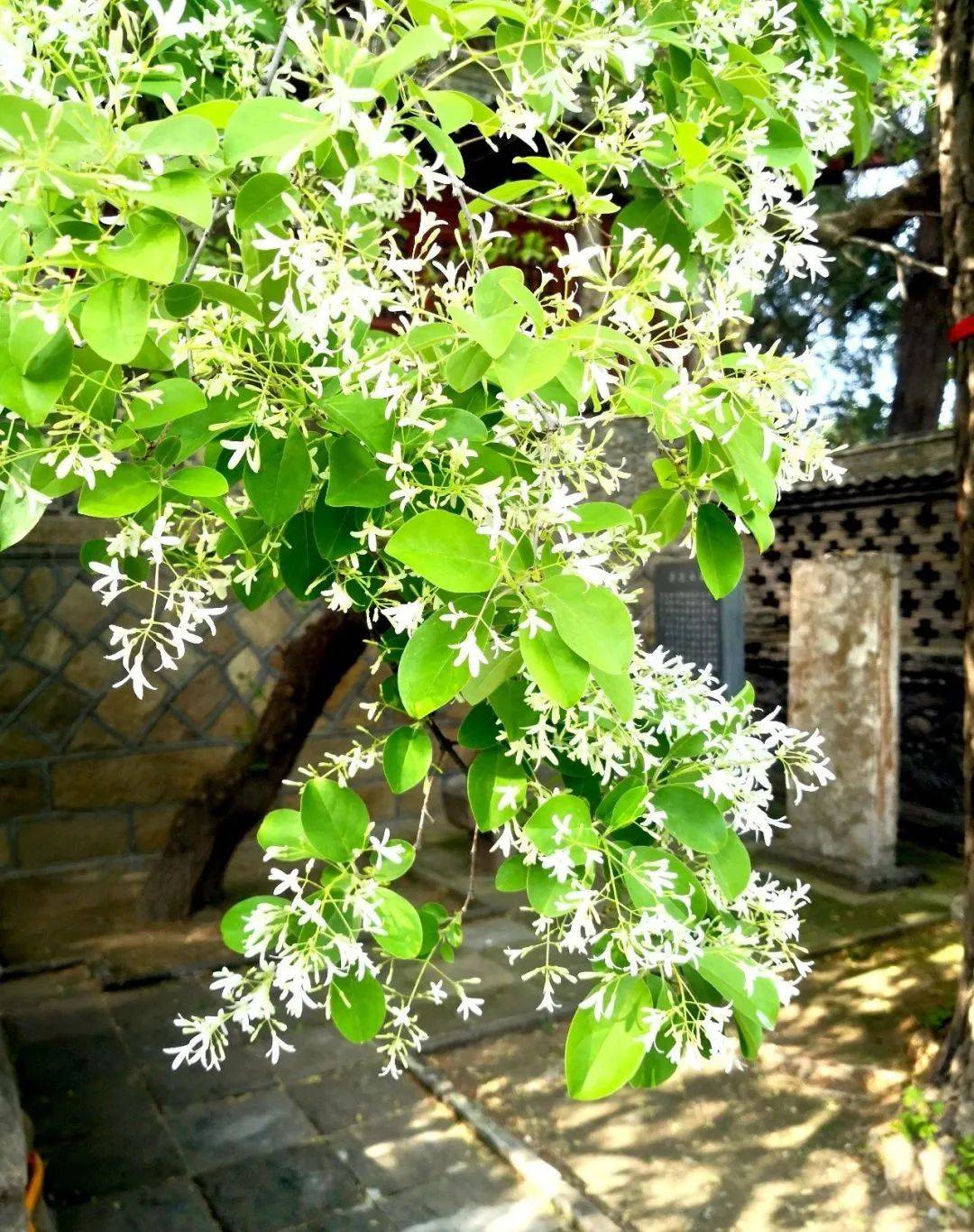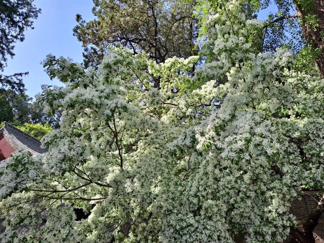 走近王母池,只见那流苏树上朵朵白花层层叠叠,接连成片,尽情的绽放,不少游人也纷纷拿出手机合影留念,深深被这古树的魅力所折服。