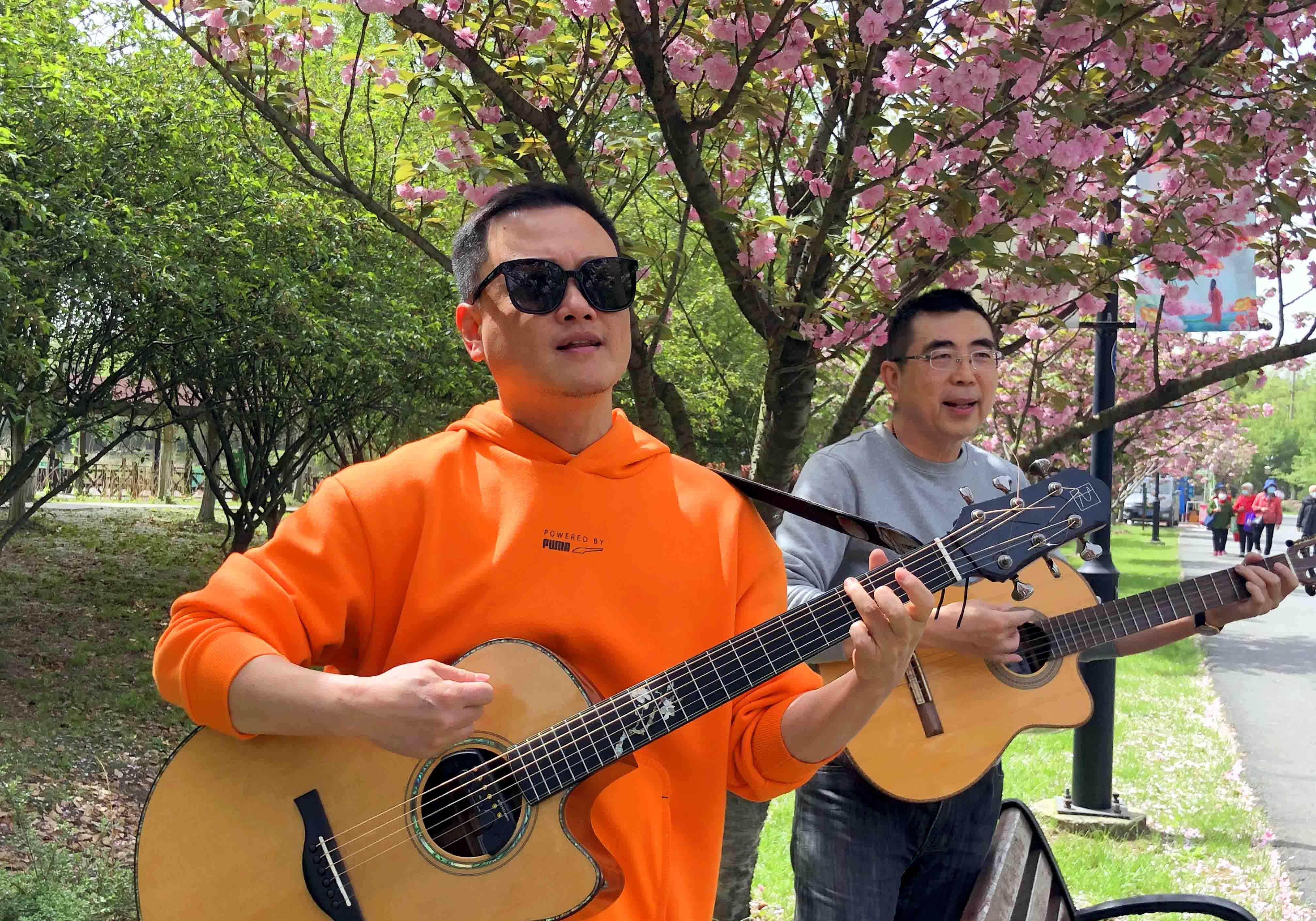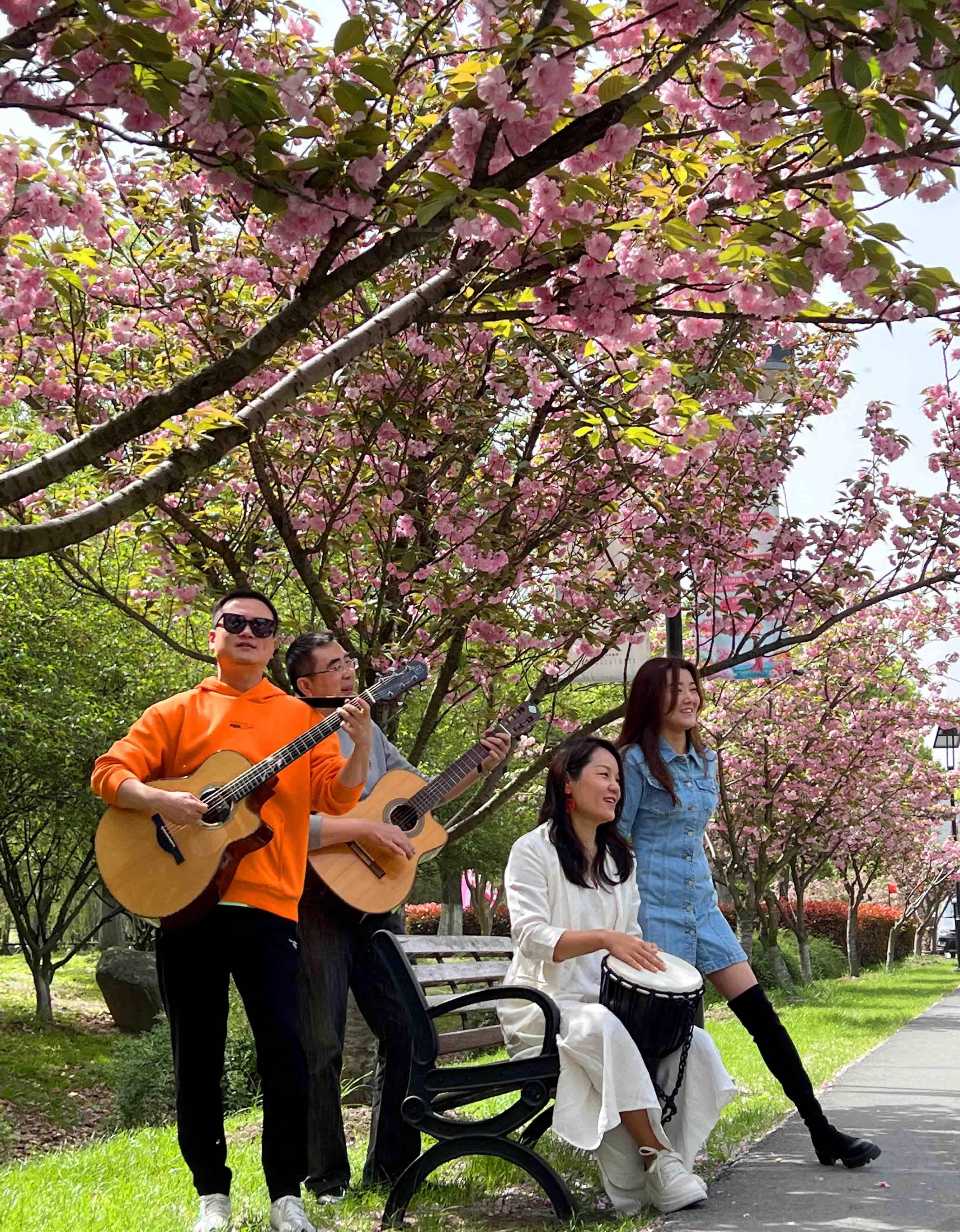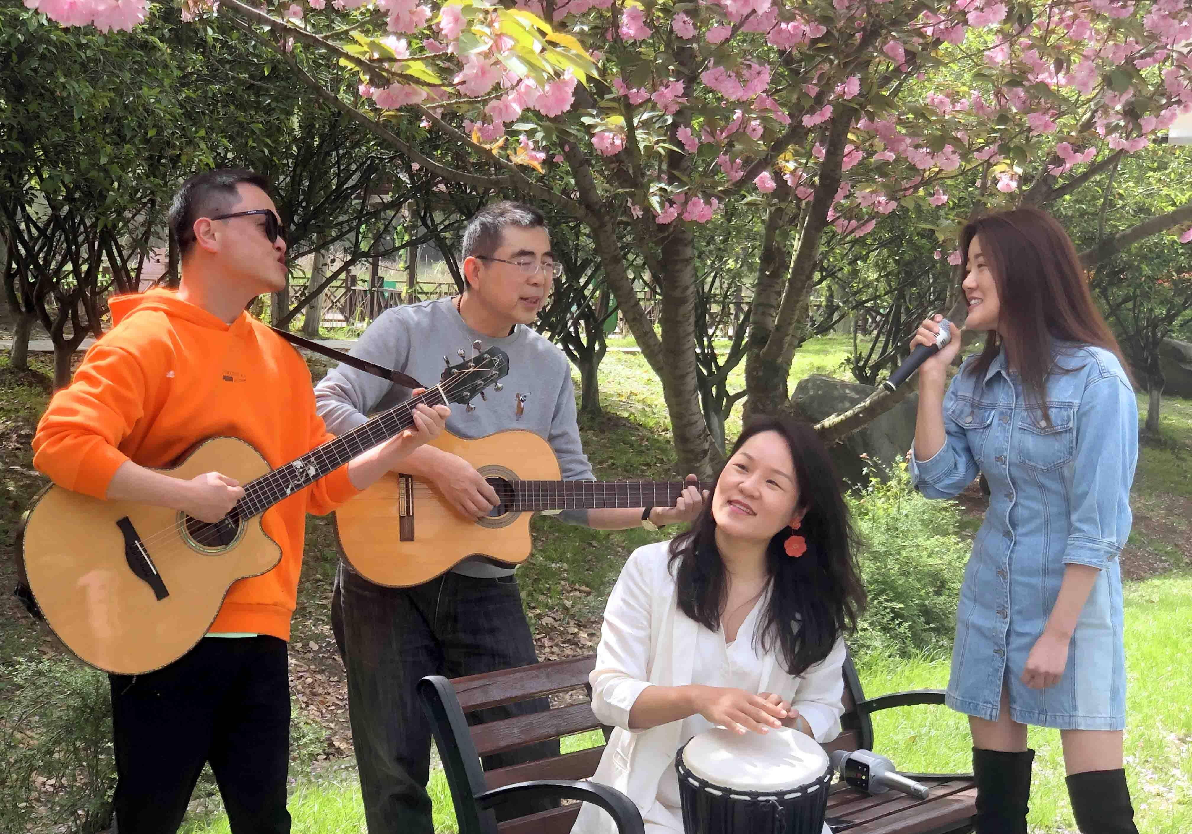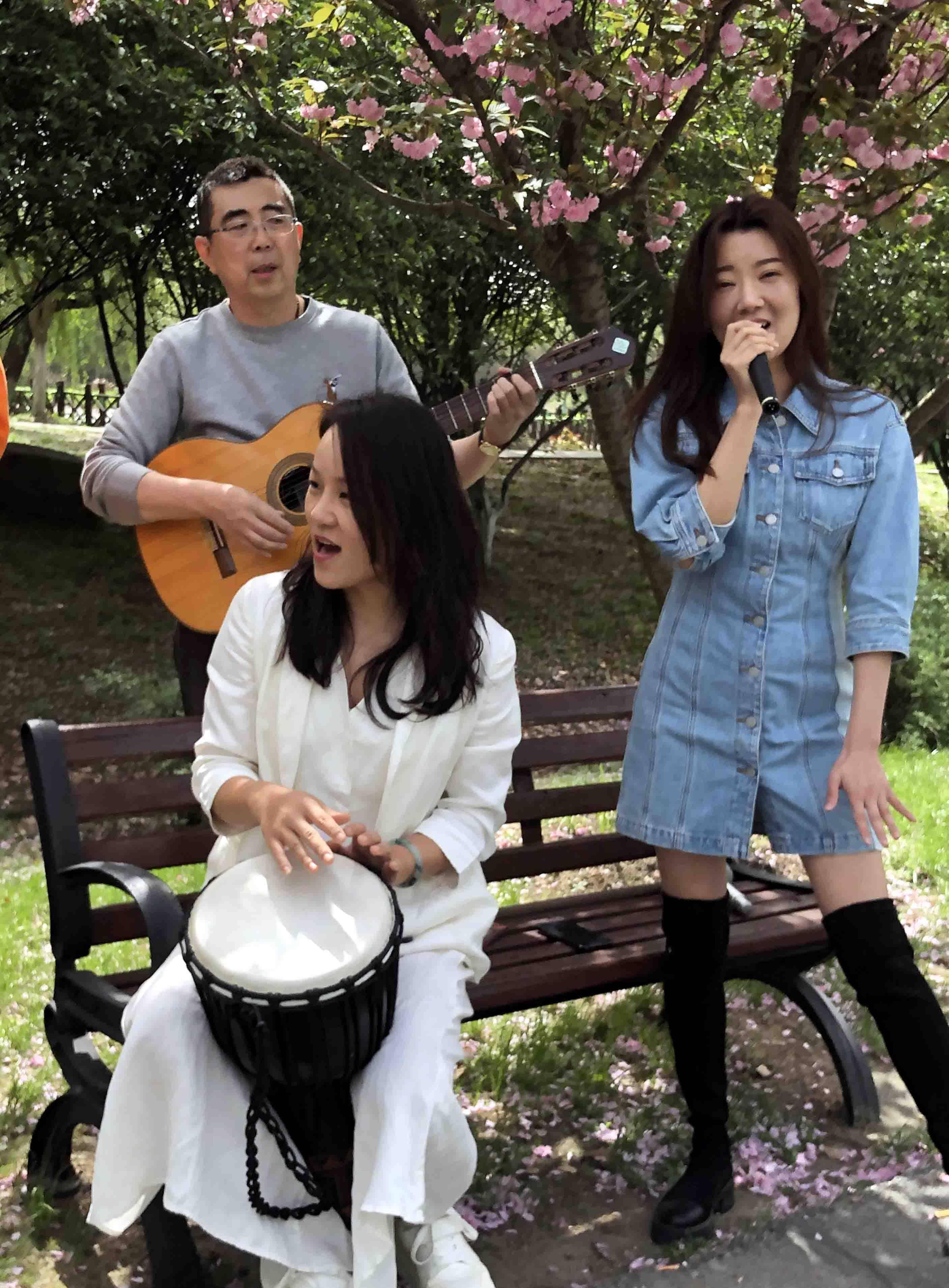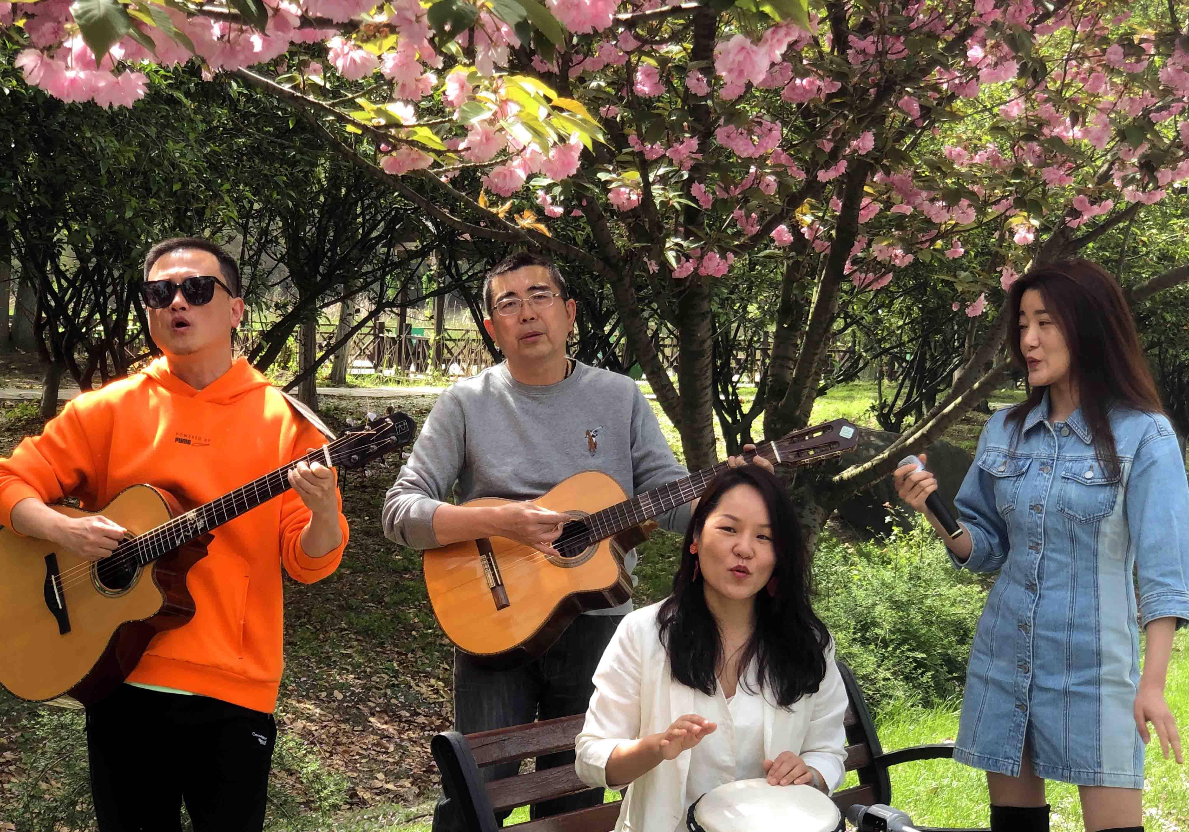 据说樱花树下的这支乐队是一个叫“碧海潮生”的乐队,他们不是专业的音乐人,而是一群“追求幸福”的乐队。