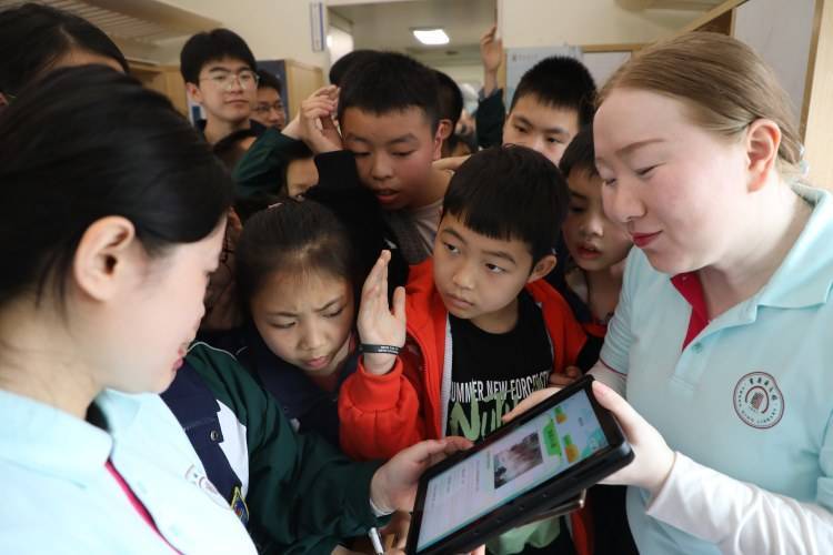 △重庆图书馆的工作人员正在向孩子们示范如何使用数字阅读资源