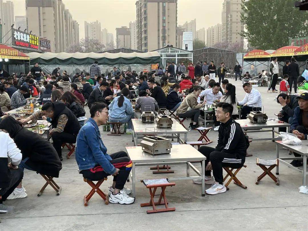 4月11晚上6时30分许,天色渐晚,山东淄博临淄区一处大院里灯火通明,空气中弥漫着烤肉的香味。十多家烧烤店紧挨着,院子里吃烧烤的人坐得满满当当,大院周围和门口的停车场也早已水泄不通。