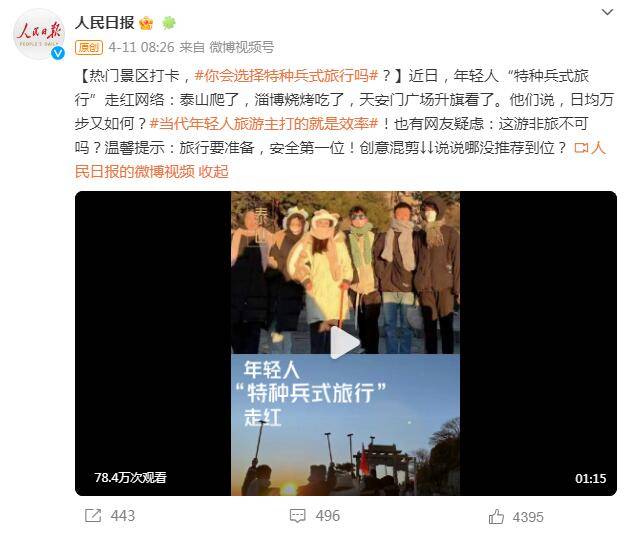 “特种兵式旅游”有多火呢?除了自媒体平台推荐、网上有百度词条以外,各大官媒也下场发布相关新闻,并以言语引导,支持该行为。