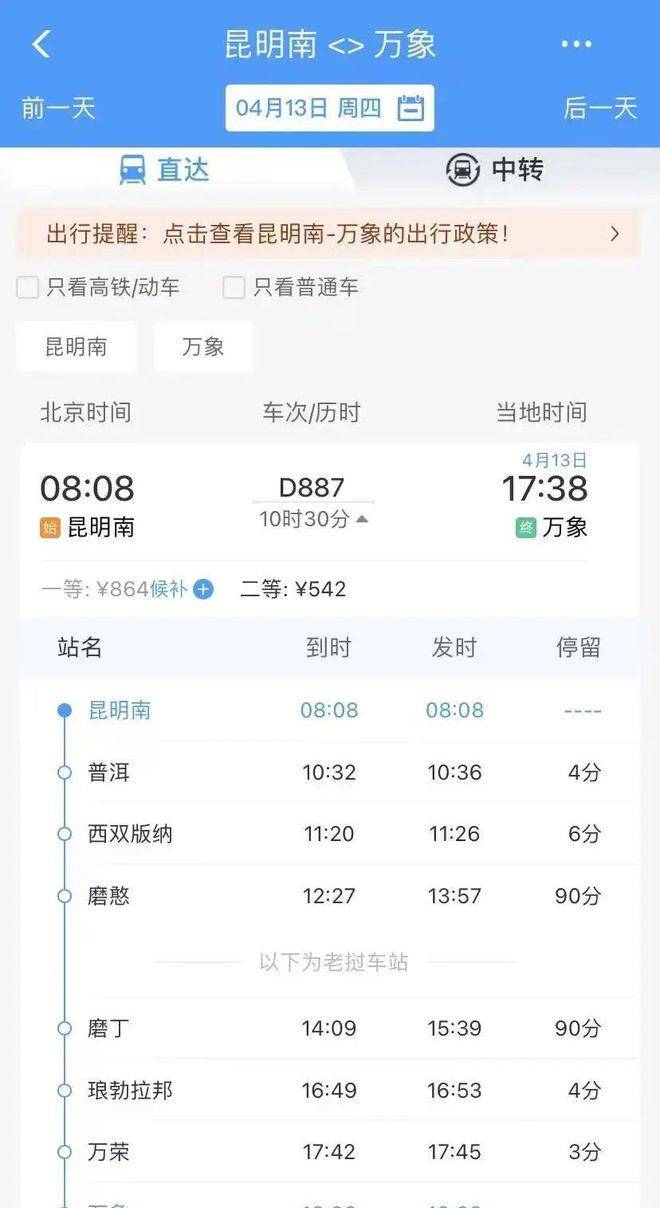 从目前发布的车次来看:昆明南至万象的D887次,北京时间昆明南8:08始发,当日18:38到达万象;