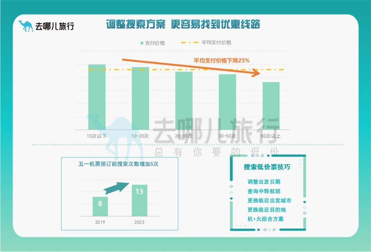 去哪儿数据统计,节假日前,用户预订前平均搜索量为13次,较2019年平均增加5次。搜索比价50次以上比搜索10次以下的用户,淘到低价票的概率更高,平均支付价格低四分之一。