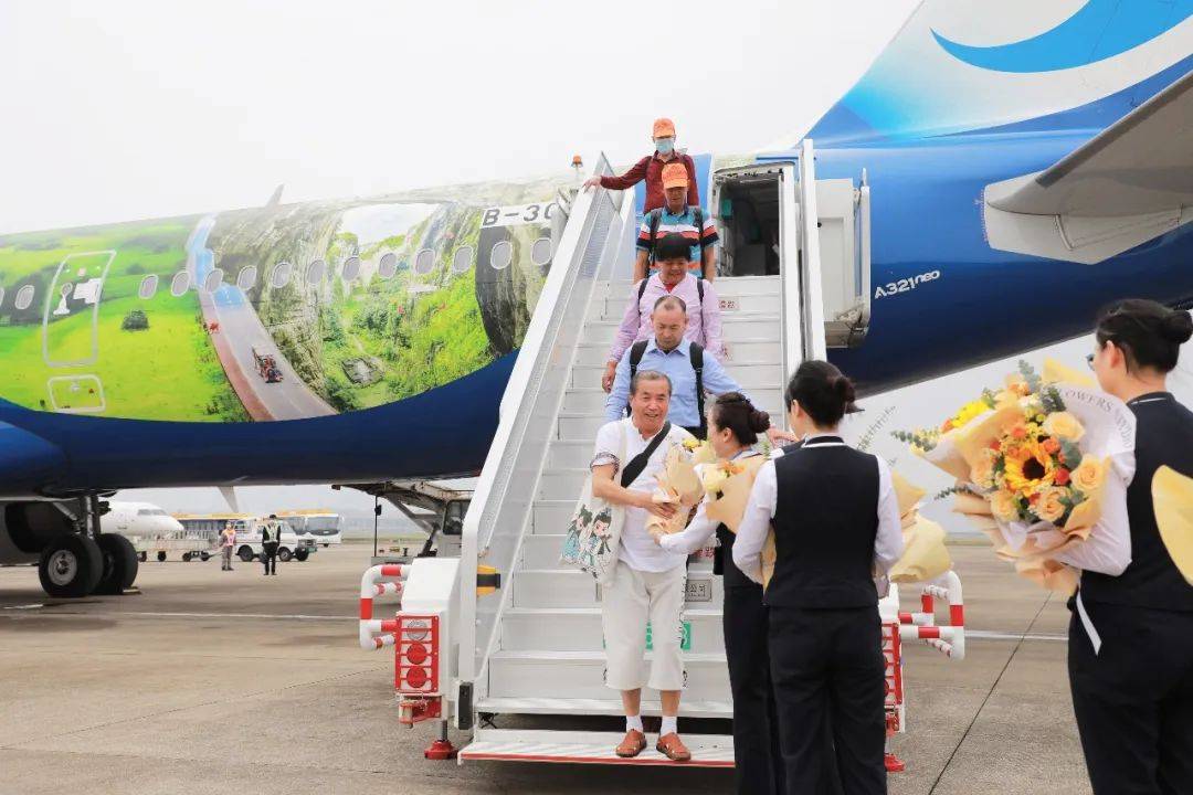 航班上,乘务组特别定制了个性化广播词,并在飞机客舱内部进行了精心布置,以武隆特色风景图片海报装点行李架和小桌板,摆放武隆旅游画册,并为旅客送上“仙女红”饮品和创意文化衫。