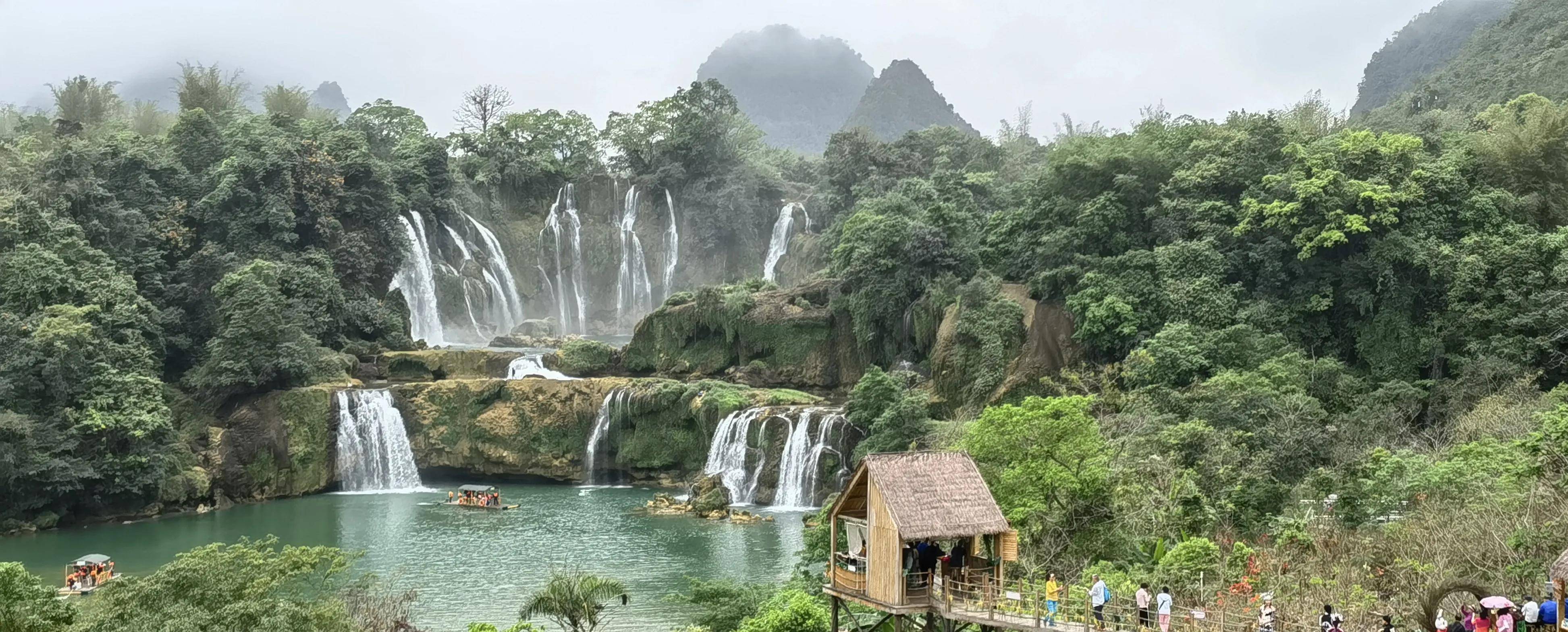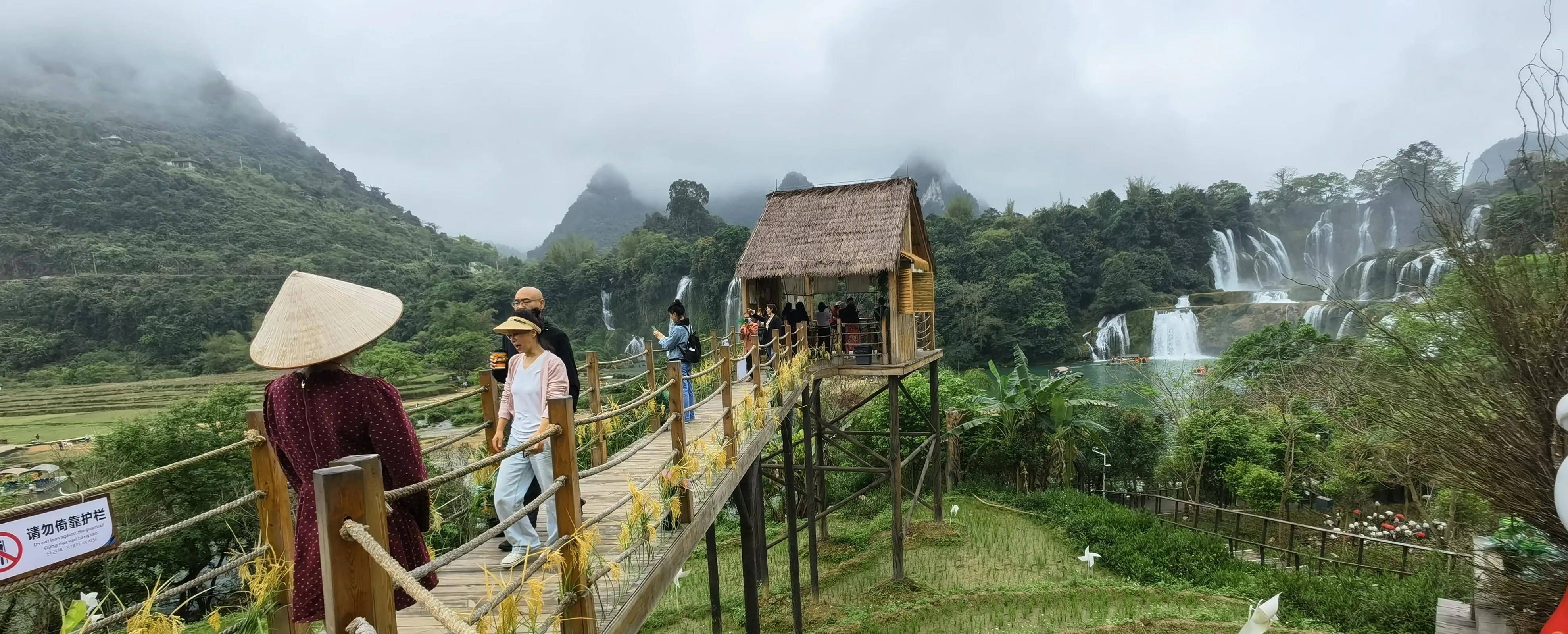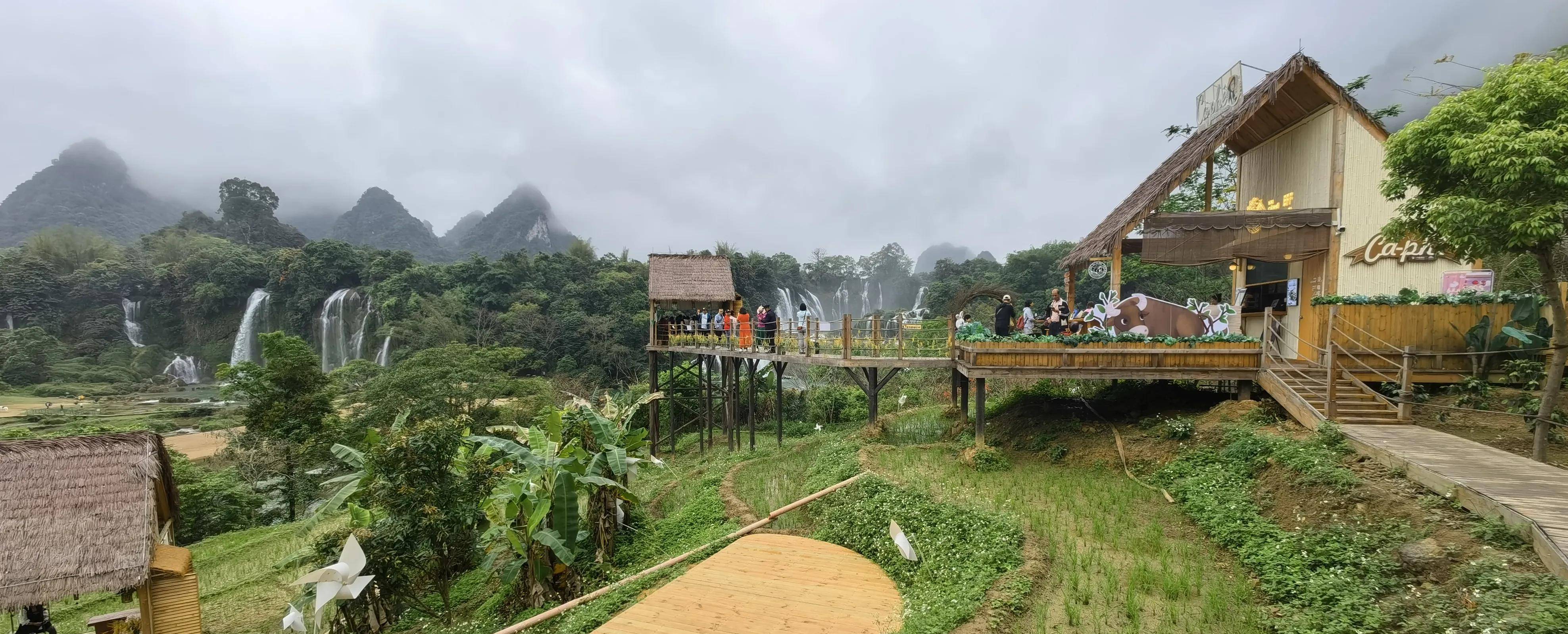 稻田咖啡屋观景台,距德天瀑布约300米,瀑布响声如雷,大气磅礴,粗粗细细,层层叠叠,与远处的冠帽山形成一幅庞大的山水画卷。