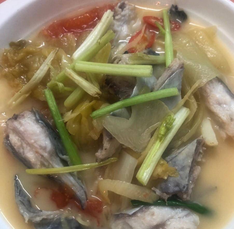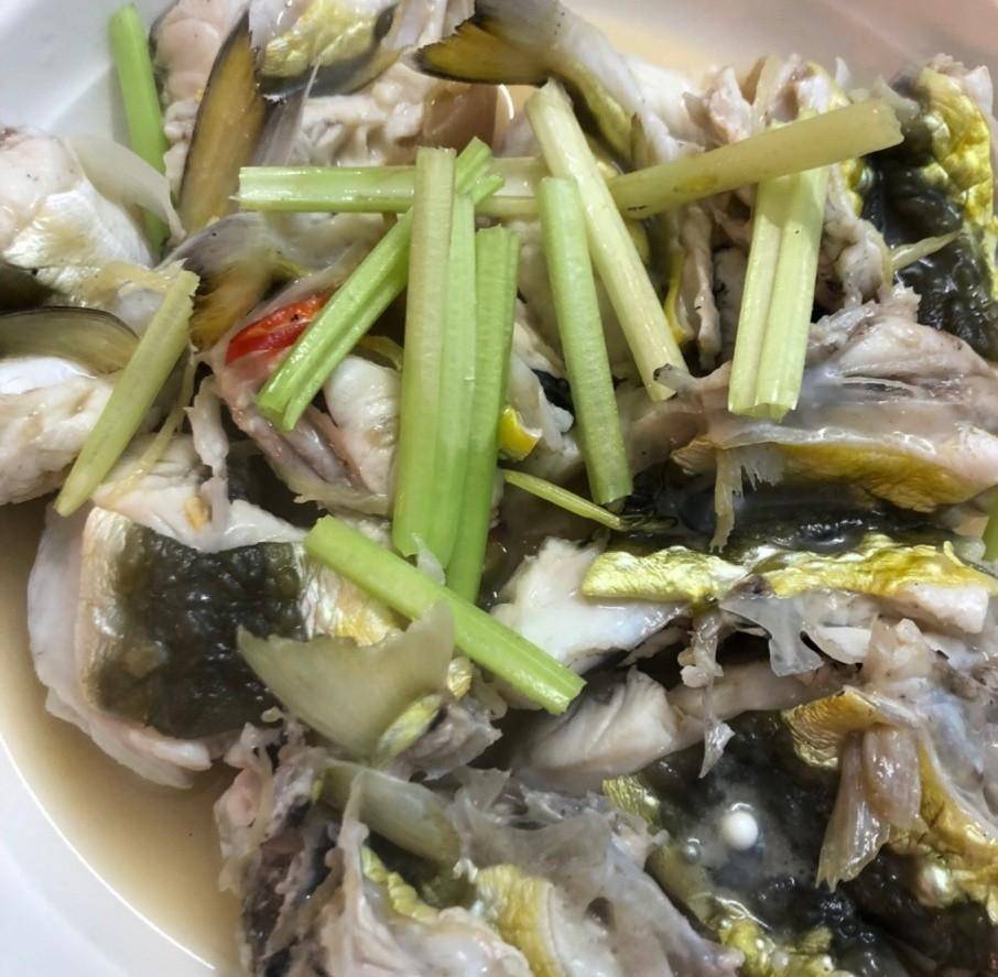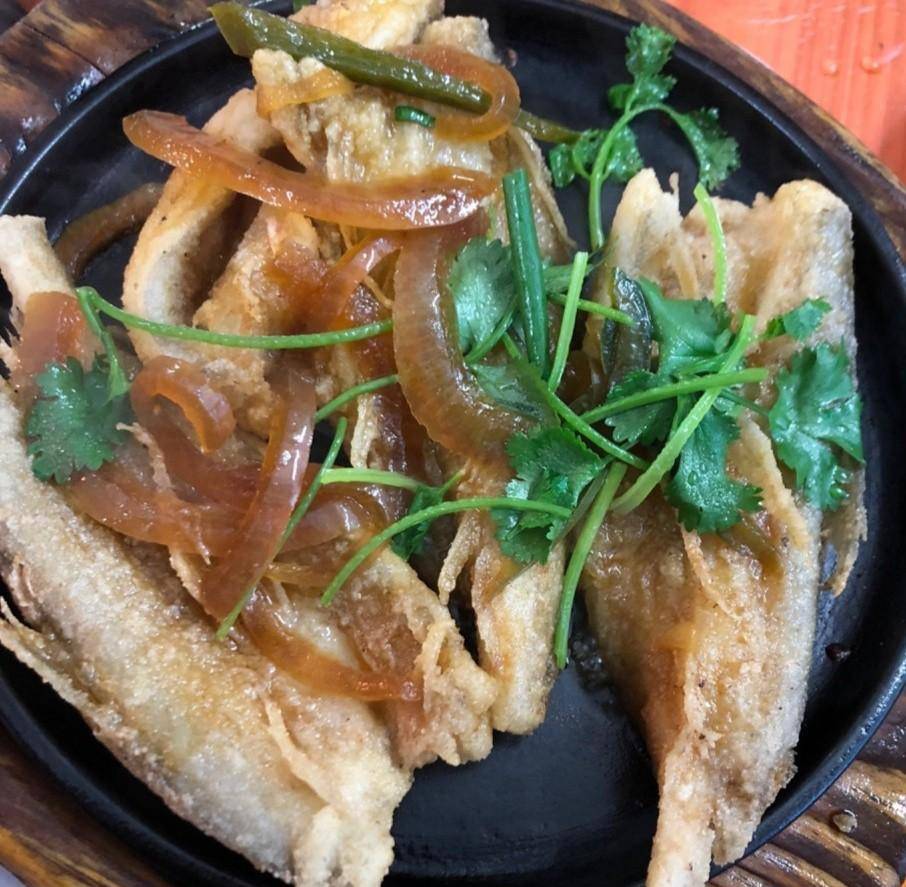 然后有这个酸菜煮的鱼头,鱼头切成小块,主要是方便入口,加了芹菜提味,鱼头本身肉质鲜美细腻,没有什么刺,吃起来很爽口。还有一条鱼也是清蒸的,看着满满的鱼腩肉就知道有多鲜美。除了蒸的之外,还有裹上面粉用铁锅来煎的鱼,比清蒸要多一份油润,光吃鱼就让人尽兴。