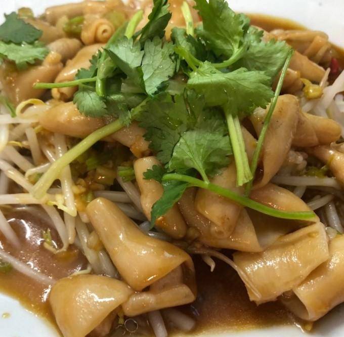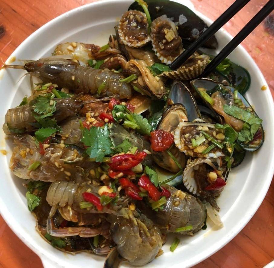 这是一道生腌,生腌是广东的特色美食,号称“潮汕毒药“,因为它的食材都没有烹饪,全是新鲜的生的,这一盘内容丰富,有血蛤、虾、青贝等等,虽然加了酱油蒜头辣椒香菜调味浸泡,吃起来酸酸辣辣很开胃,但是没有经过高温烹饪,不知道里面有没有戏剧,吃了随时就可以拉肚子。