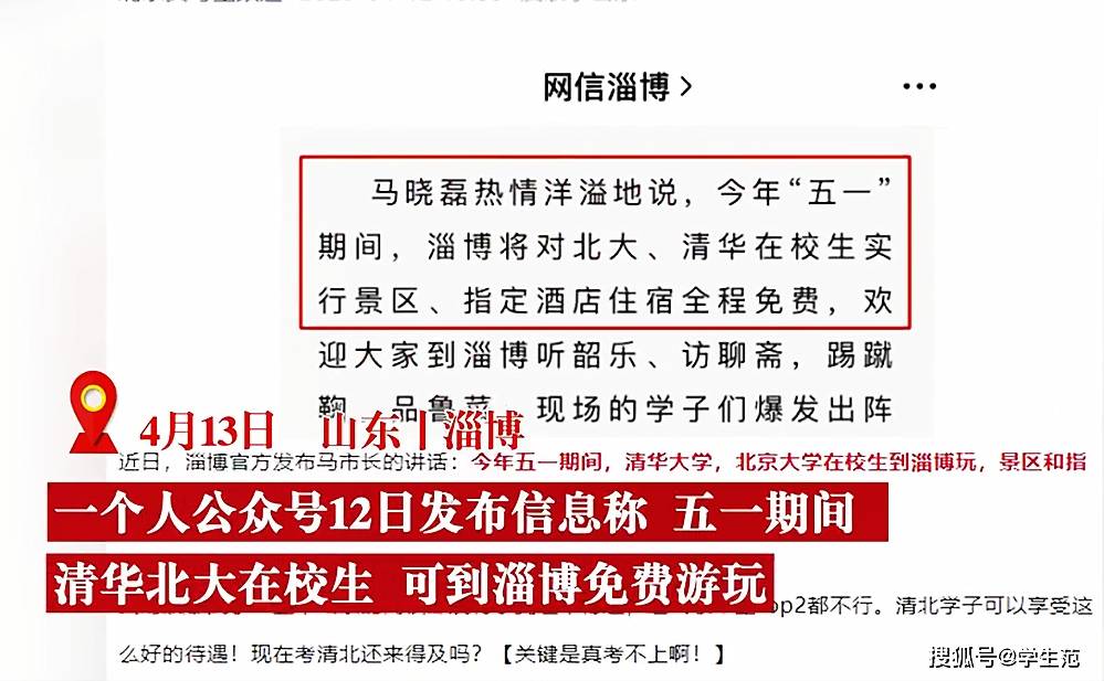 旅游资源并不丰富的淄博市因为“烧烤”而成了网红城市,在烧烤热度还未消退的背景下,今天淄博市又再一次地冲上了热搜榜,原因是什么呢?那就是“清华北大在校生五一可到淄博免费游”,免费到什么程度呢?市委书记马晓磊在宣讲会上明确说了,今年“五一”期间,淄博将对北大、清华在校生实行景区、指定酒店住宿全程免费,欢迎大家到淄博听韶乐、访聊斋,踢蹴鞠、品鲁菜。此次活动共安排4条线路,时间约2-3天,参与活动的清华、北大学生只需要购买往返淄博的车票,其他吃住以及游玩等费用均由淄博市政府出资。