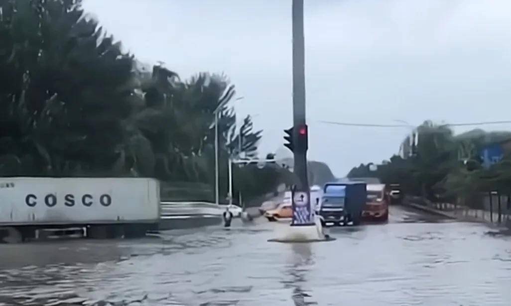 百股桥洞是锦州外环的交通要道,而且多是大货车和大巴车,双向四车道,通行以车辆为主,南入口坡度不大,但北出口坡度大一些形成了低洼地段儿,雨天积水量大,且交通严重堵塞,交警便在水中指挥交通,真是辛苦。