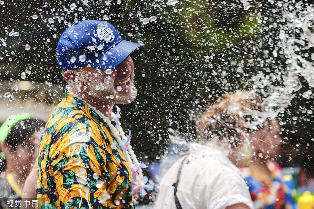 当地时间2023年4月13日,泰国曼谷,一名男子向一名西方游客泼水,庆祝泼水节。视觉中国 图