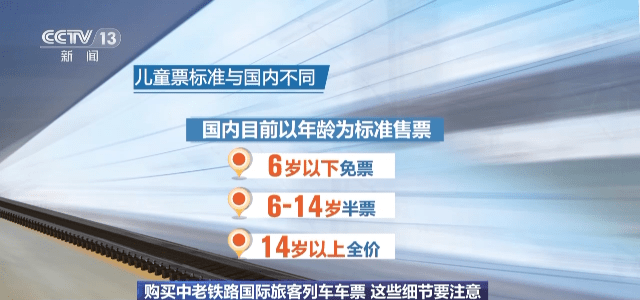 儿童票标准与国内不同:国内目前以年龄为标准售票,6岁以下免票,6-14岁半票,14岁以上全价。而中老铁路的跨境车票业务是以身高和年龄两个标准来定价。身高1.2m~1.5m的未成年人可购买儿童票。每一名持票成年人旅客可免费携带一名身高不足1.2m且不单独占用席位的未成年人乘车,超过一名时,超过人数应购买儿童票。免费乘车的未成年人单独使用席位时应购买儿童票。身高超过1.5m的未成年人使用儿童票时,补收儿童票价与全价票价的差额。