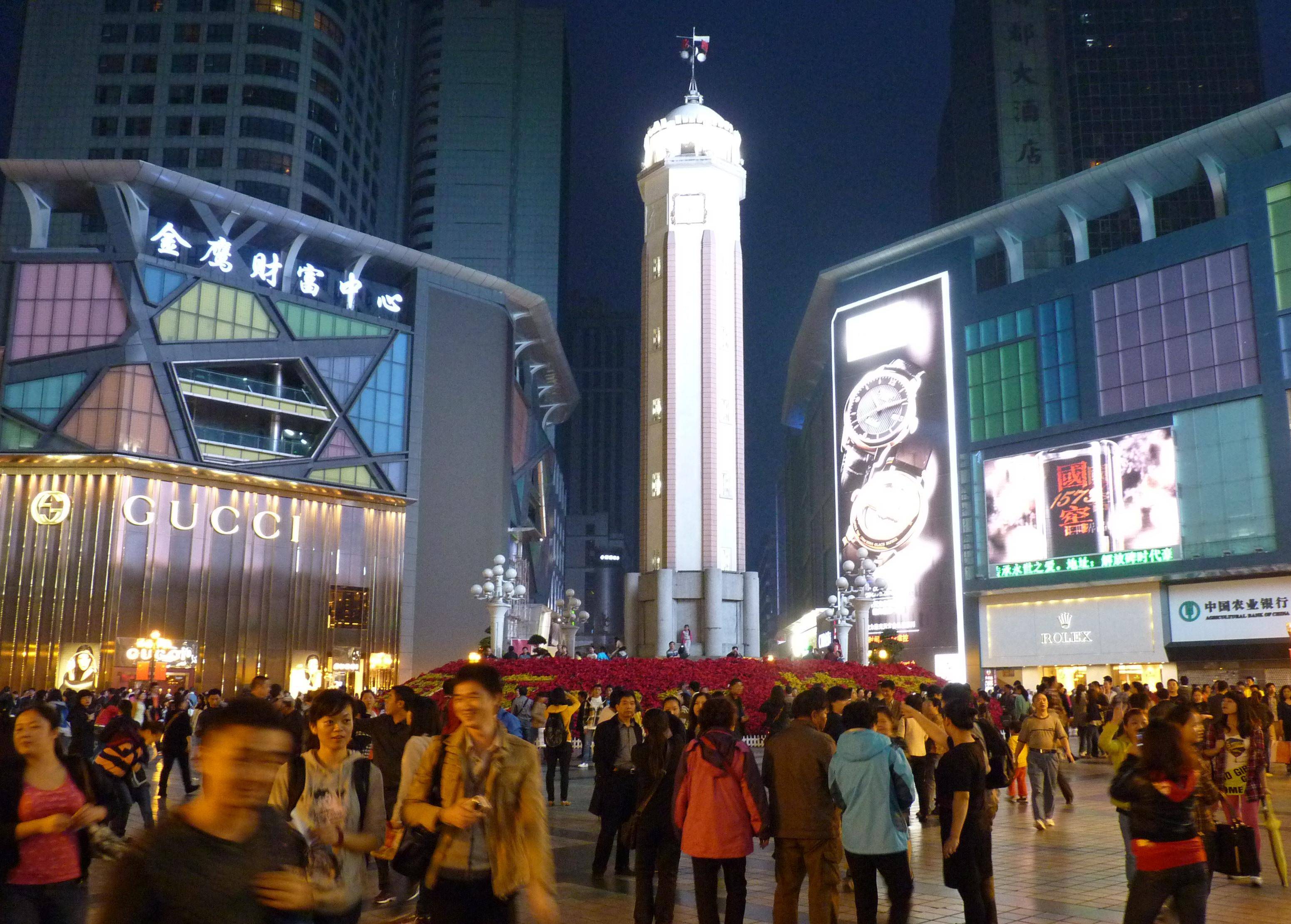 解放碑步行街,位于重庆市渝中区,是以人民解放纪念碑为中心将解放碑附近十字地区改造成为中国西部第一条商业步行街,有着“西部第一街”的美誉。