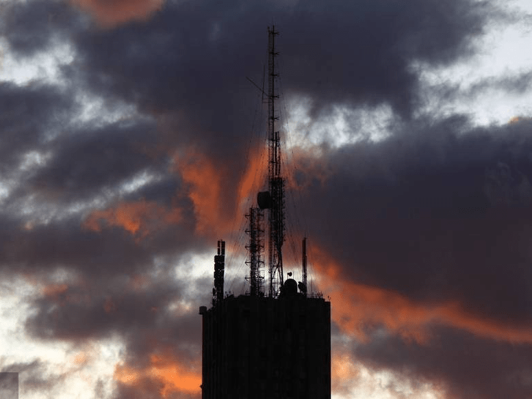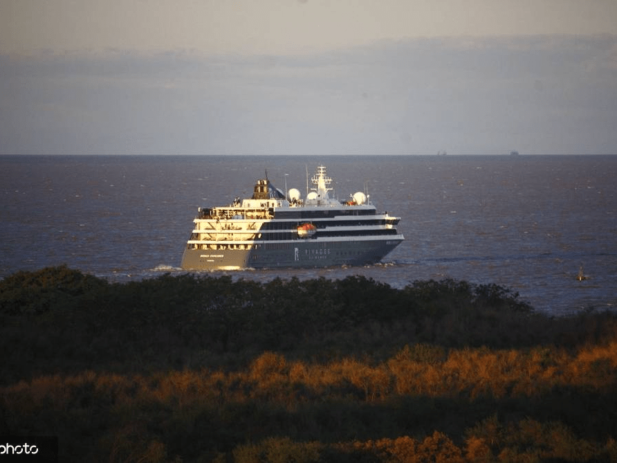 阿根廷首都布宜诺斯艾利斯市,一艘邮轮在夕阳余晖下驶离海港。