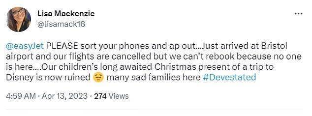 另一位乘客说:“易捷航空,请解决你们的电话和应用程序问题。我们刚到布里斯托尔机场,我们的航班被取消了,但我们无法重新预订,因为没有人在这里。我们孩子期待已久的圣诞礼物——去迪士尼的旅行现在已经毁了。许多悲伤的家庭在这里。”