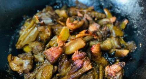 接着在炒锅里热锅放油,放入麻油,再放入生姜煸炒至表皮发黄,再放刚才煮好的鸭肉一起进去煸炒,翻炒均匀,炒至脱水脱油,鸭肉微黄的时候,再把其他的配料一起放进去。最后一步就是在锅里加入适量的水烧开,再拿出炖锅,把刚才炒锅里面的所有食材都移到炖锅里面去,加上我们准备好了高粱酒,盖上盖子炖煮一到两个小时,我们家一般是煮一个半小时,比较稳妥。