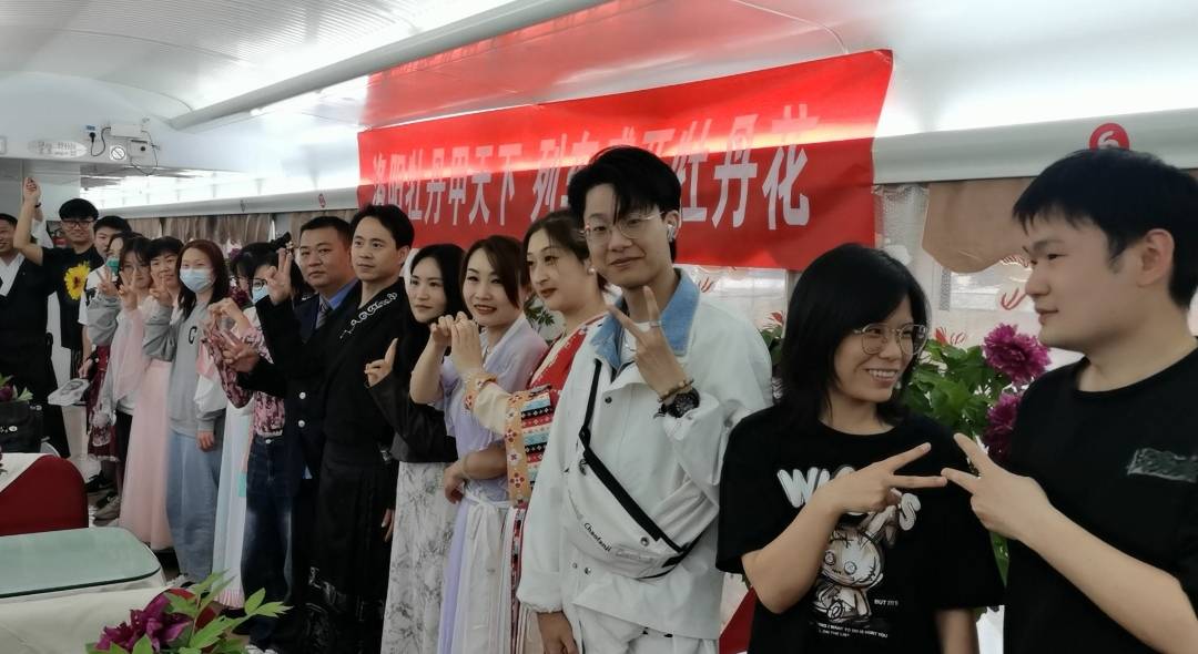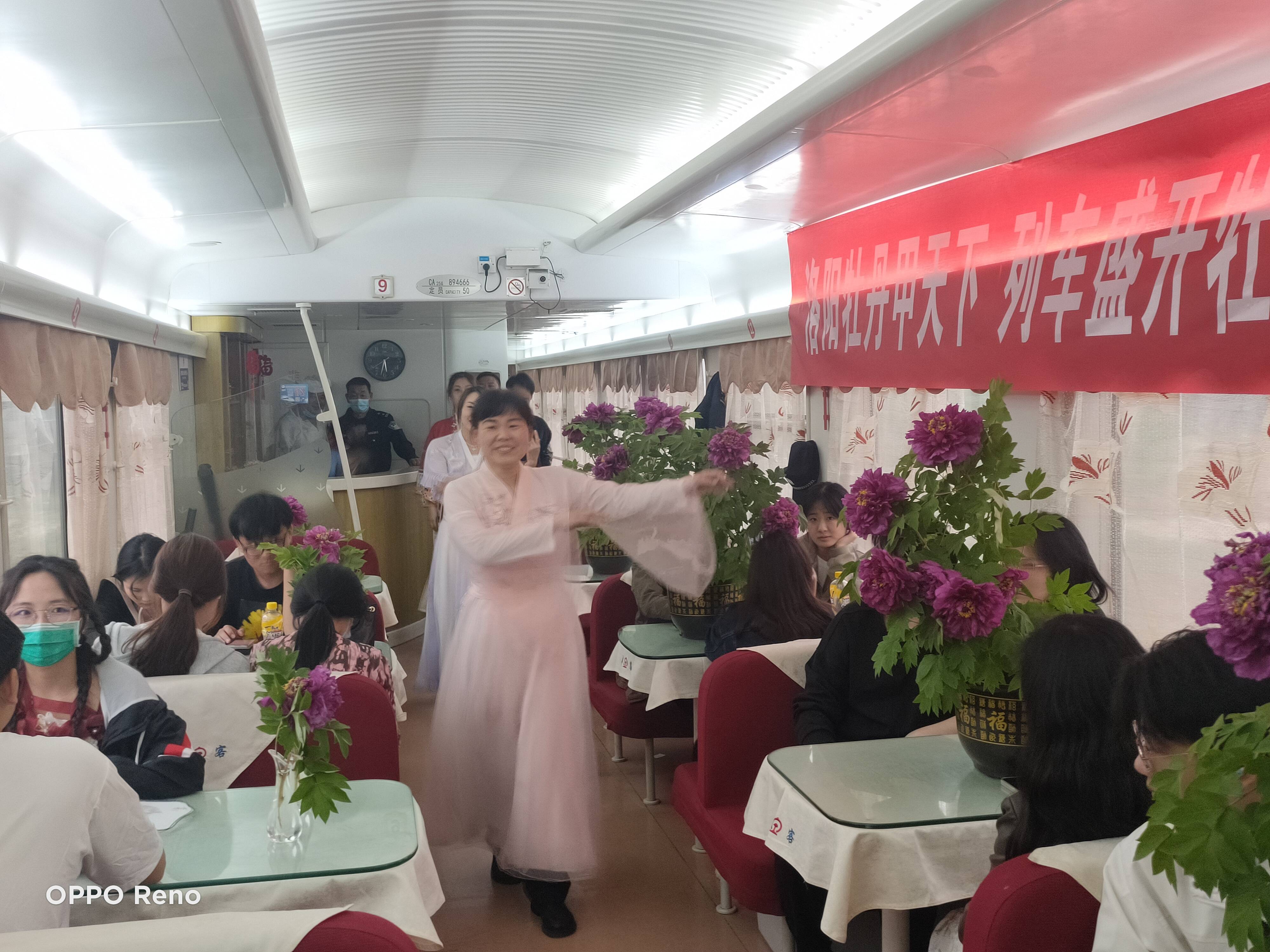 4月13日在9号餐车乘务员装扮成“花仙子”,伴着洛阳牡丹翩翩起舞。车队还贴心的在餐车设置了互动拍照点,吸引不少旅客驻足拍照合影。来自宝丰的旅客李梅参加了列车牡丹文化活动激动的说:“这次到洛阳出差没时间看牡丹,没想到在列车上看到了婀娜多姿雍容华贵的牡丹花,列车还为我们准备了这么好的交流活动,今天乘坐火车真的很开心。”