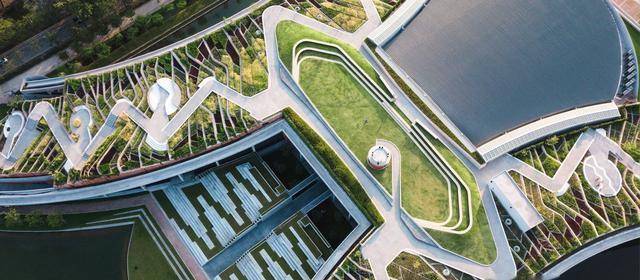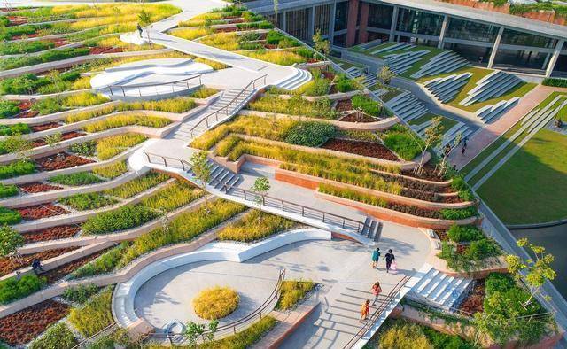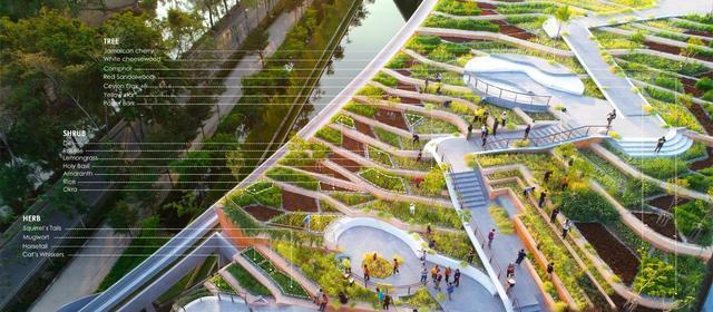 在景观设计中,设计师试图让垂直建筑与食物来源产生重合,于是在受到了东南亚山区的传统农业实践的独创性启发后,农场采用了传统水稻梯田的形式,结构采用古老的夯土技术建造,并将其土方工程与现代绿色屋顶技术相结合,实现了现代景观与传统农业的创意发展。相比传统的混凝土屋顶,经过层叠设计的梯田屋顶更能有效减缓多达20倍的雨水径流。