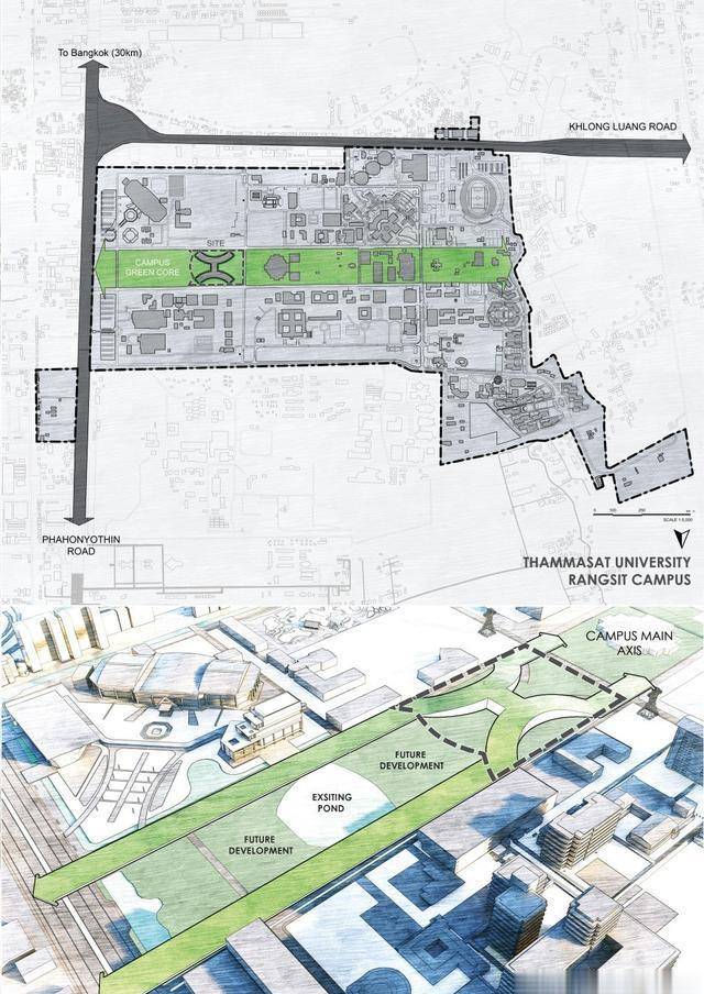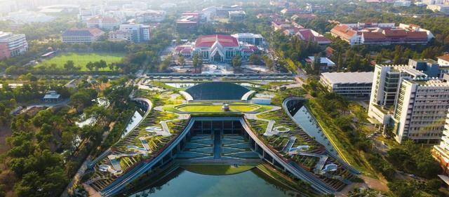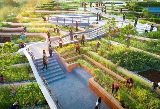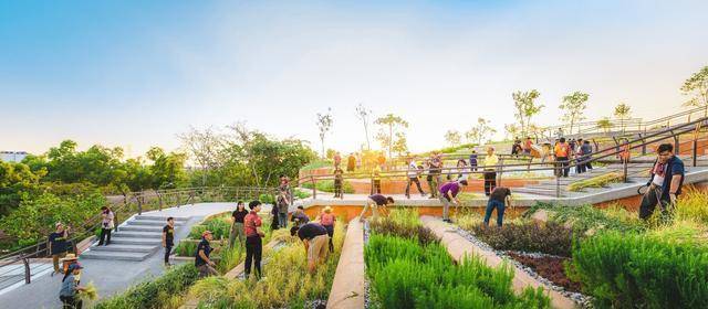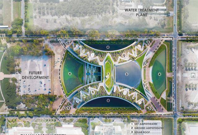 于是,为了振兴其所处的土地,泰国国立法政大学(Thammasat University),在设计师的帮助下,重新利用了建筑上被忽视的236806平方英尺的(约22000平方米)屋顶空间,包括有7000平方米的农业区,打造了一个亚洲最大的屋顶有机农场。农场融合了可持续粮食生产、能源再生、有机废物、水资源管理,创造了校园综合循环经济,同时农场还可满足城市休闲,是一处公共活动空间。接下来,小编就说一说这座屋顶农场的具体设计。