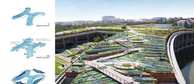 当雨水击中屋顶时,首先农作物的种植加强了土壤的肥沃度,减少了雨水期间的水土流失,并有效防止污染径流和空气中的毒素从排水系统和自然水体中进入。多余的雨水会沿着斜坡蜿蜒而下,下一层梯田就会收集上一层的径流,所到之处会形成独特的小分水岭群,帮助吸收、过滤和净化雨水。