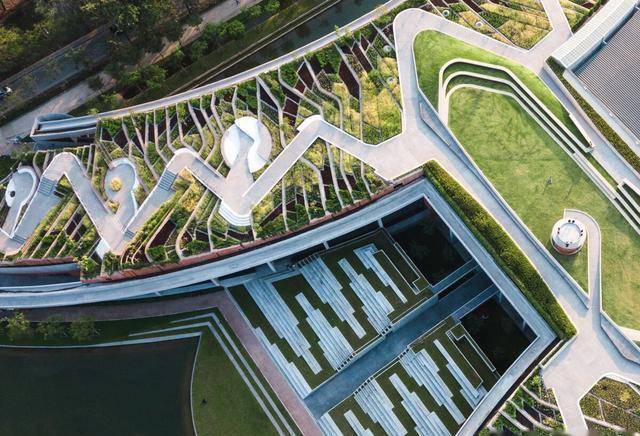 设计师充分利用地形的每一个层次,最大限度地利用地形坡面,创造出一个山地式的多功能公共空间,占地7,000 平方米。斜坡上设计了12个可作为室外教室的椭圆形的空间,这些散布在楼梯上的“小口袋”提供了亲密的社交空间和通往种植区域的通道。如果你有幸爬到农场顶层,就能在广袤无垠的天空下360度全方位感受曼谷景色。大型圆形剧场还为所有游客提供了一个便捷、灵活的娱乐和教育空间。