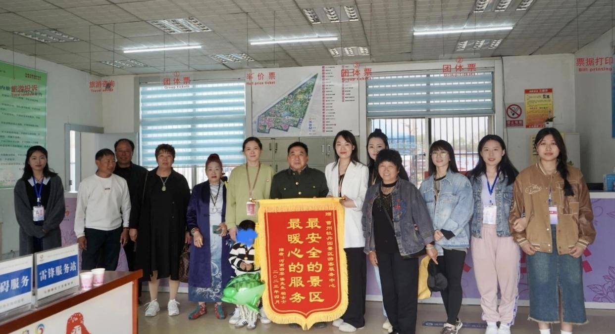 4月13日上午,家住河南省开封市的侯先生一家五口带着一面绣有“最安全的景区、最暖心的服务”的锦旗,专程赶到曹州牡丹园景区,感谢景区工作人员帮助他们找回走失的孩子。