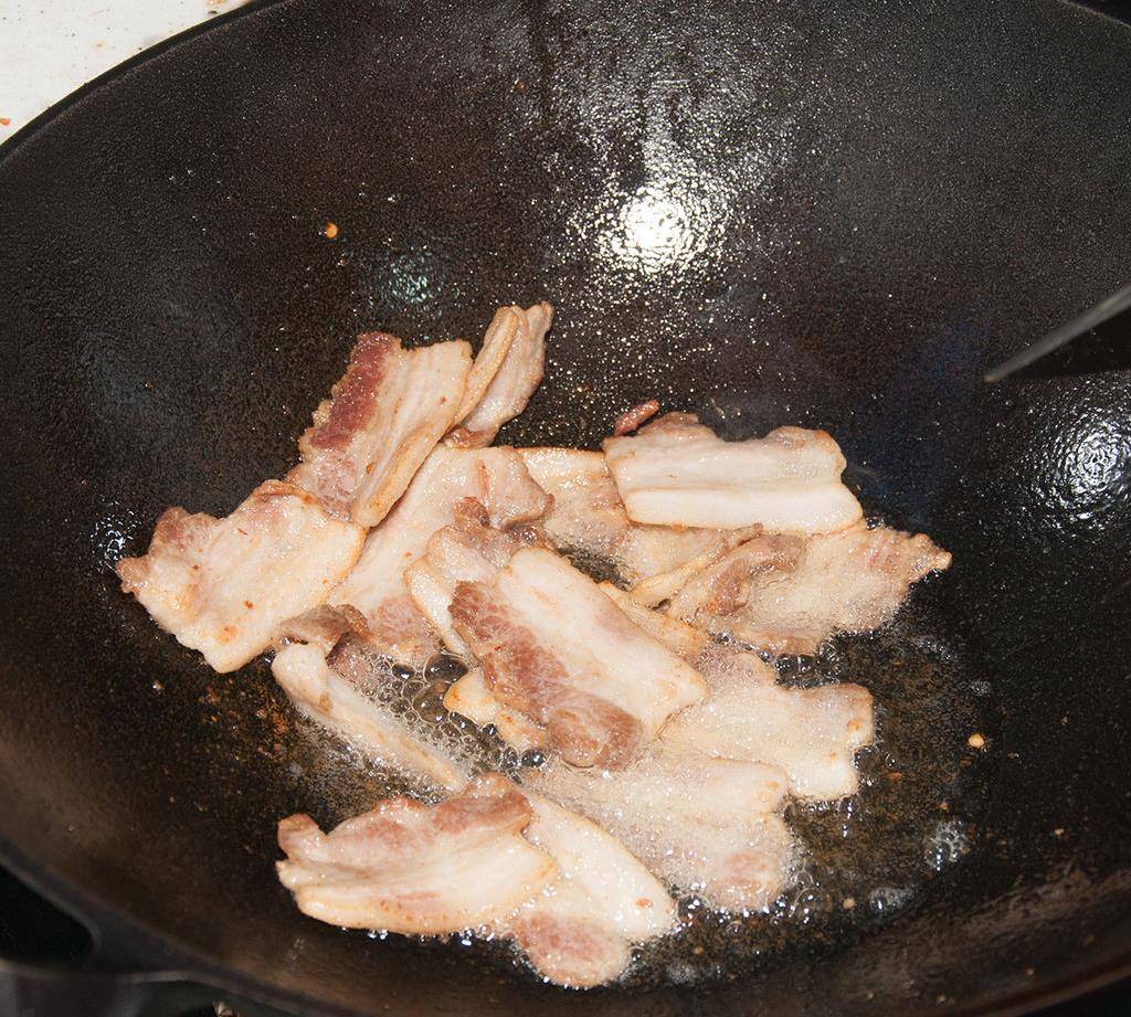 一切准备就绪,起火上炒锅。先别放油,将肉放到锅里直接下锅煎,将肉里的油,给逼出来。这一步是为了防止油在肉里不出来,咬下一口满口的油,影响口感不说,容易吃腻。煎肉这一块是个慢工活,不能操之过急。起初因为没有放油的缘故,肉可能会粘锅,这个时候不能着急,记得翻炒,等油激出来之后,就会不会有粘锅的情况出现了。等肉煎制表面泛黄,有些许焦黄感的时候捞出控油。这个时候肉比较脆,撒上椒盐就是一盘菜。注意如果选用别的部位的肉,尤其是用精肉时,一定要记得放油!