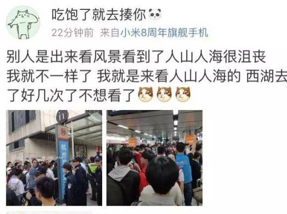 很多网友在微博、朋友圈上“卖惨”:五一就应该待在家里,杭州地铁都挤死人了。