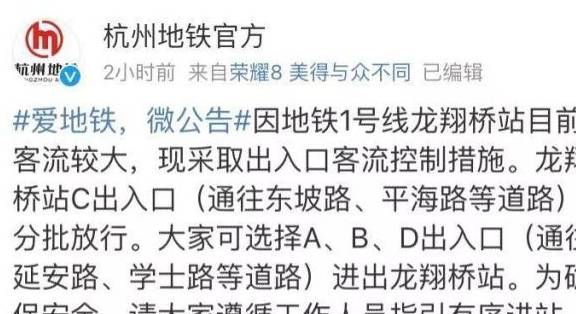 果不其然,下午13:51,地铁1号线龙翔桥站因客流较大,采取出入口客流控制措施。龙翔桥站C出入口(通往东坡路、平海路等道路)分批放行。大家可选择A、B、D出入口(通往延安路、学士路等道路)进出龙翔桥站。